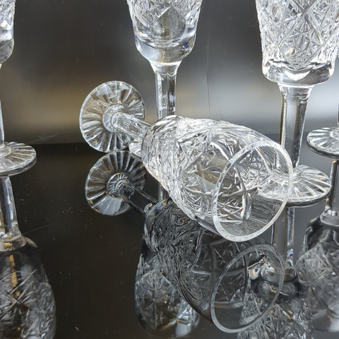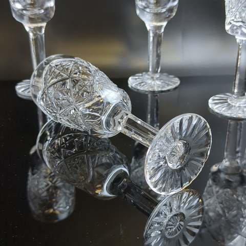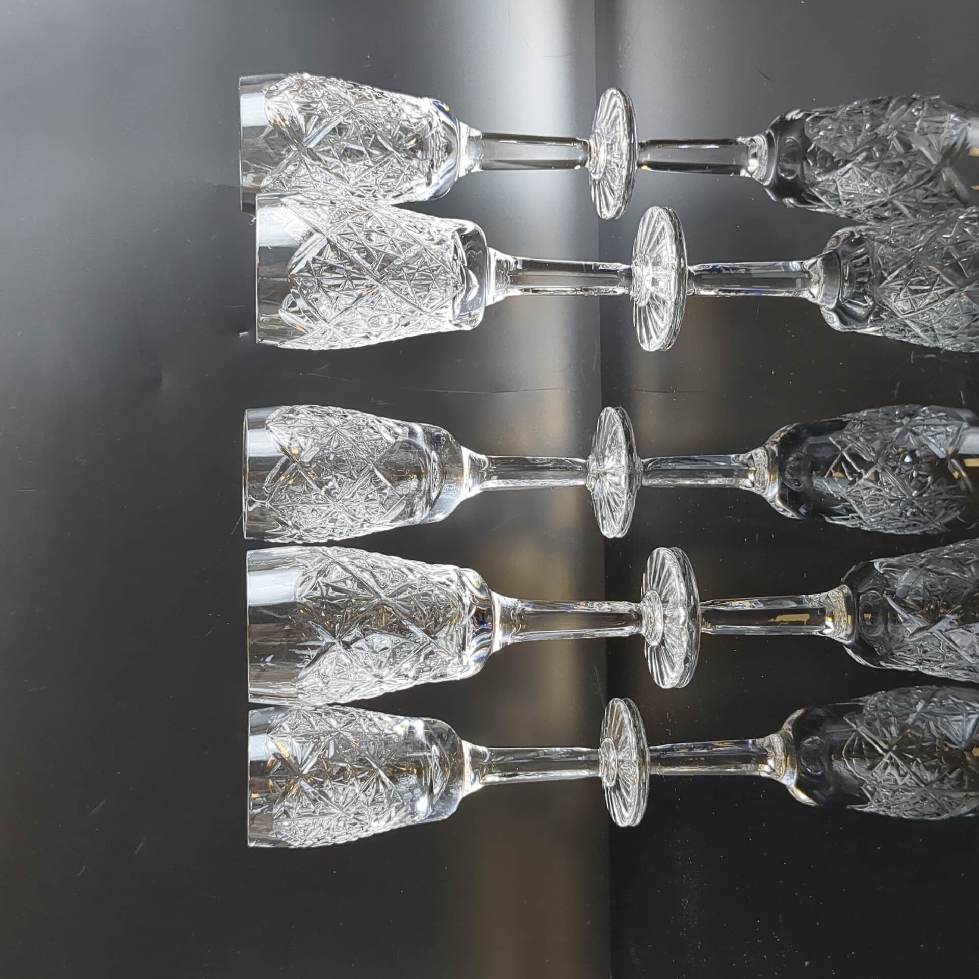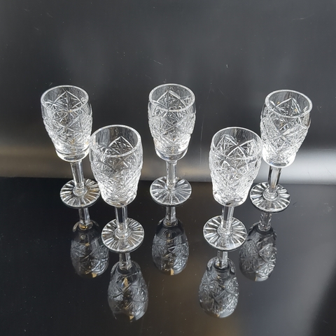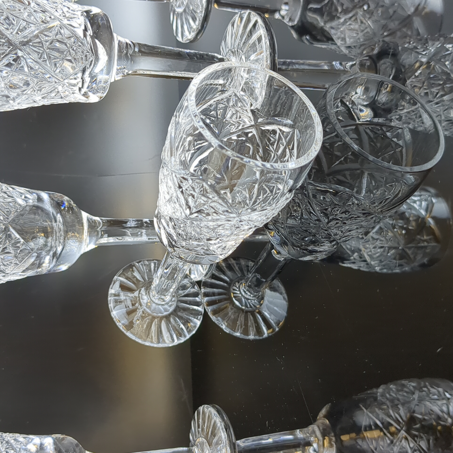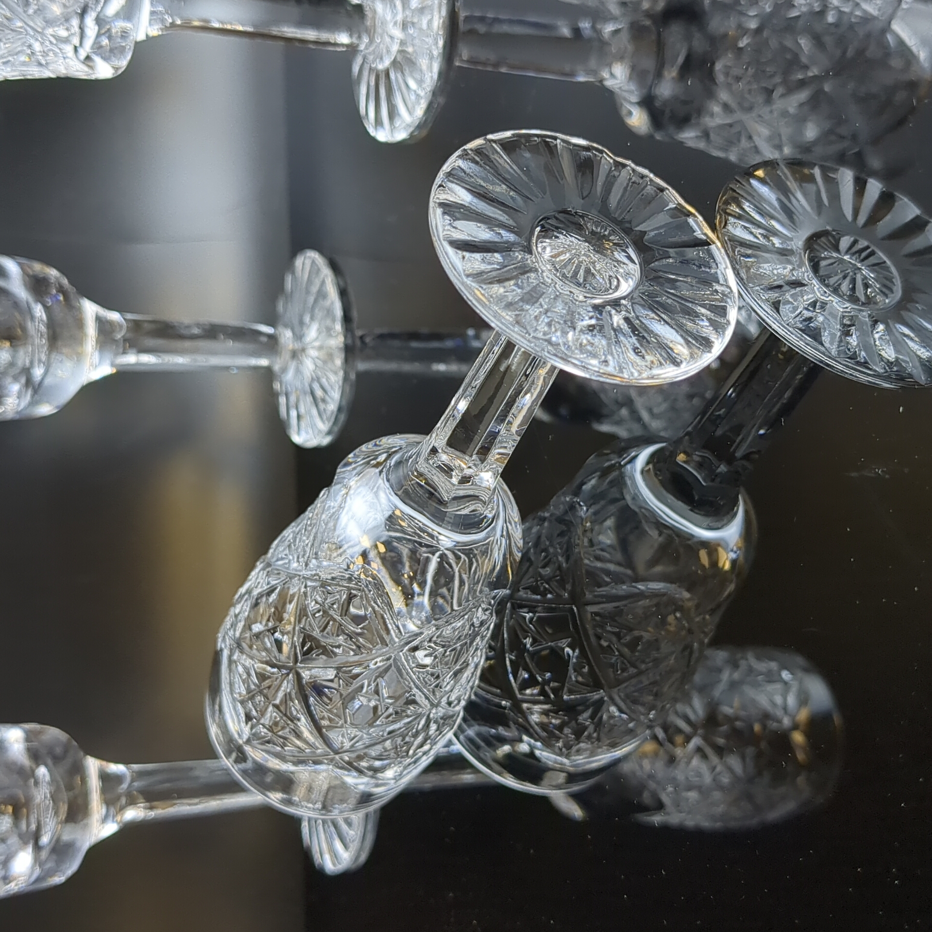 Фужеры хрустальные набор из 5 штук на ножке, алмазная грань, геометрический орнамент, высота- 12.5 см, винтаж СССР 1970-1990 гг. Состояние и комплектация на фото