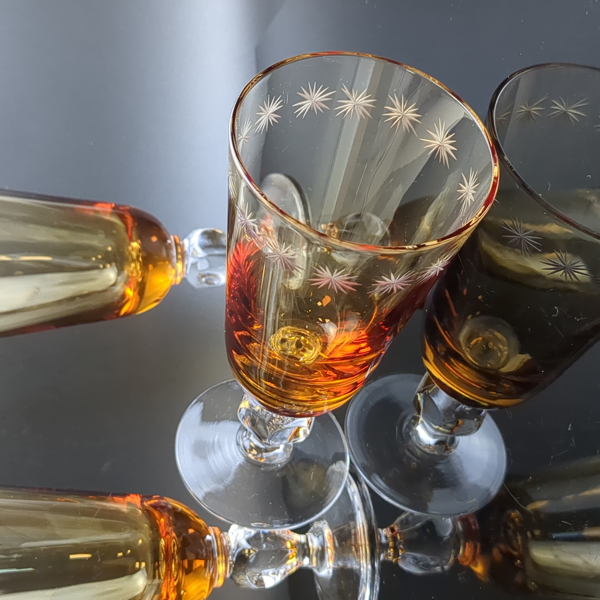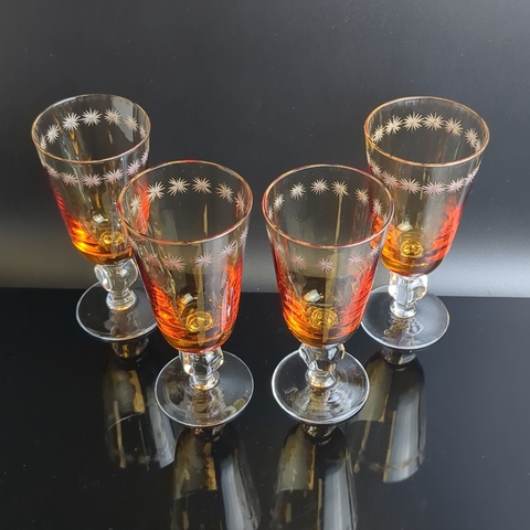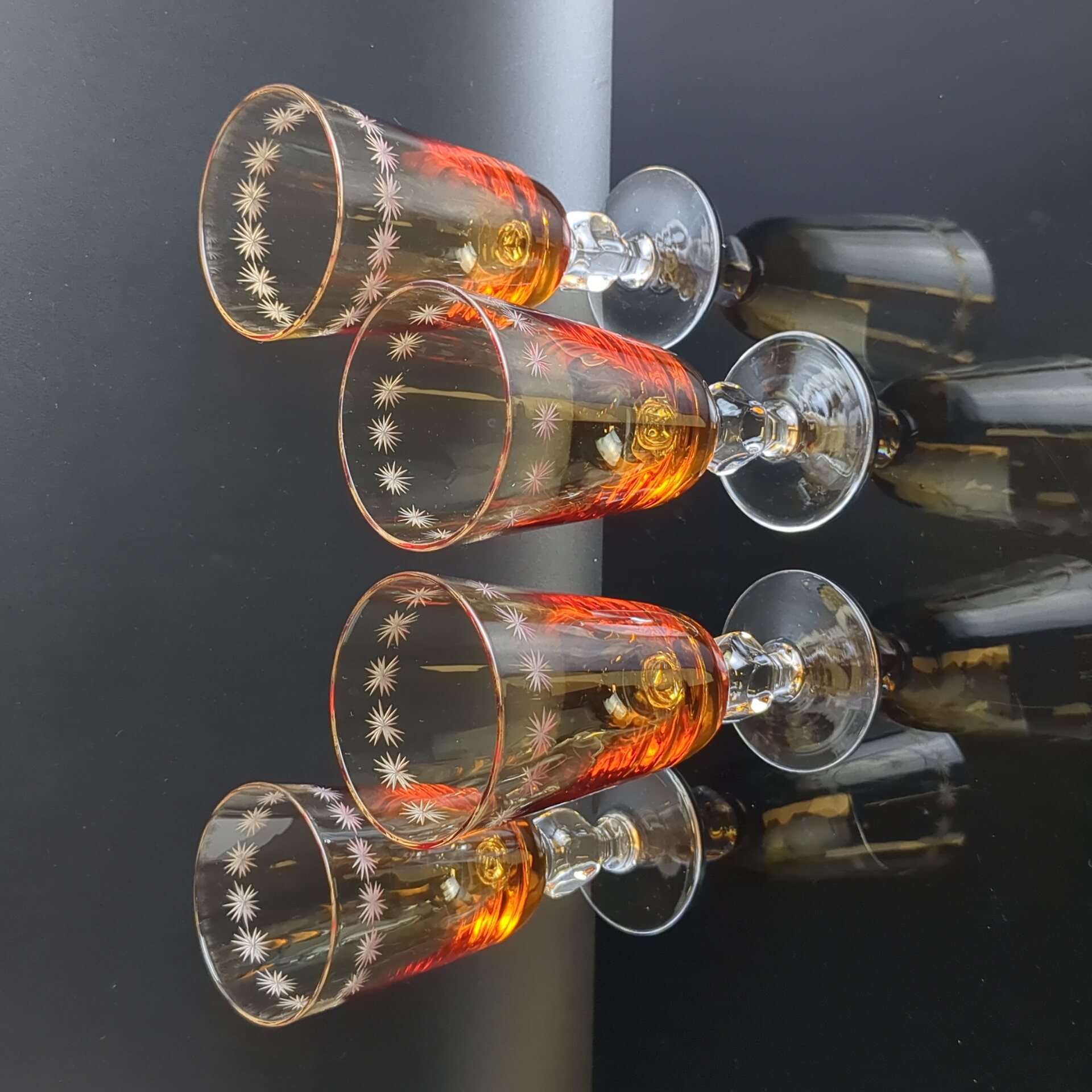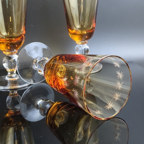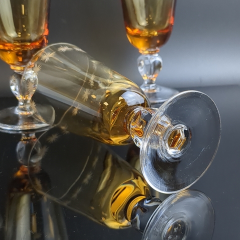 Фужеры, бокалы "Золотая свадьба" набор из 4 штук, янтарный цвет, хрусталь, ГХЗ, художник Е.И. Рогов, резной декор, винтаж СССР 1970-1980 гг.