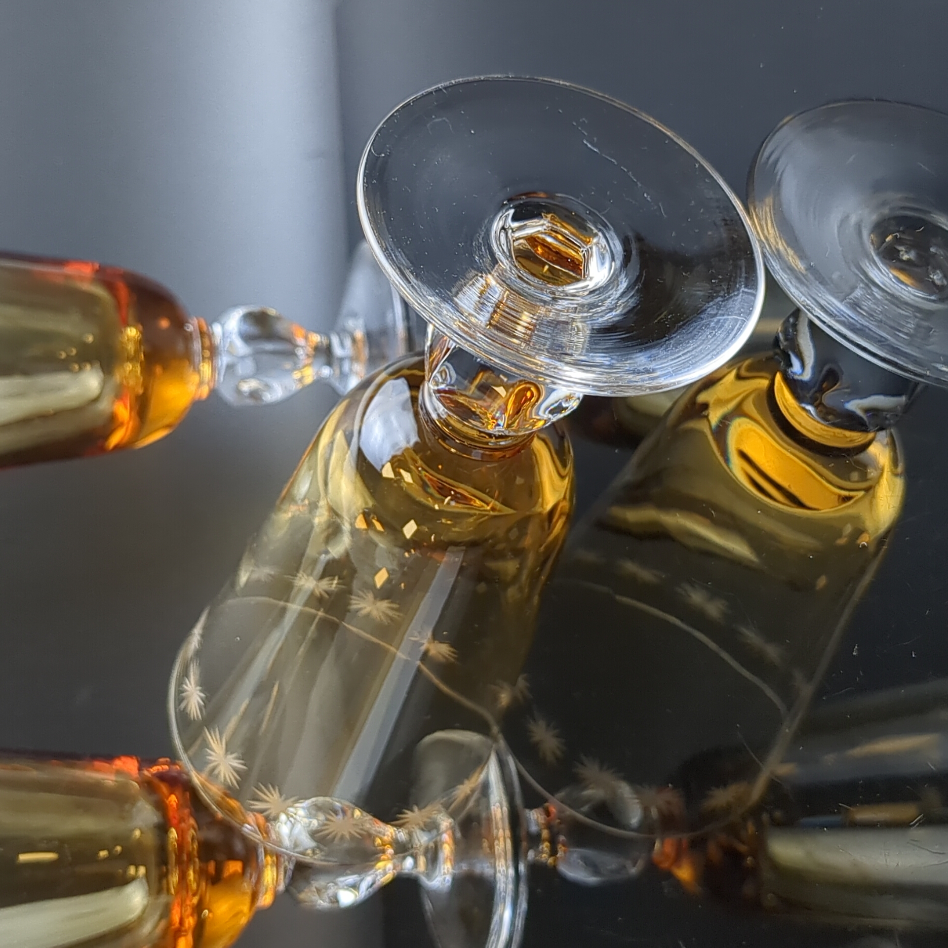 Чаша из медово-коньячного хрусталя, ножка прозрачная. Край бокала обрамляет веночек из 15 звёздочек нарезанных вручную.