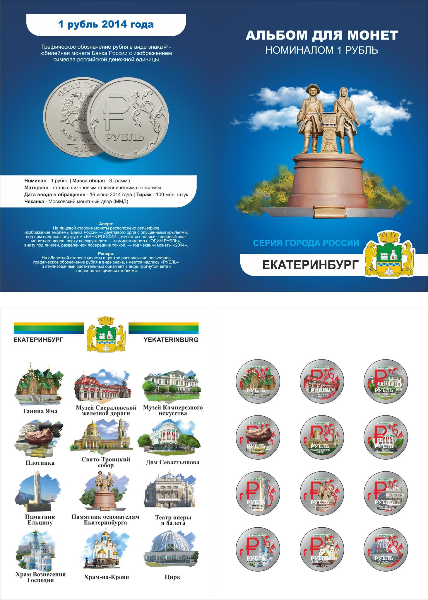 Набор из 12 монет с эмалью "г. Екатеринбург" номиналом 1 рубль в альбоме.
