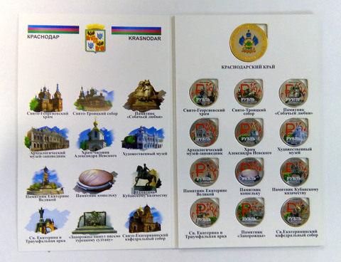 Набор из 12 монет с эмалью "г. Краснодар" номиналом 1 рубль в альбоме.