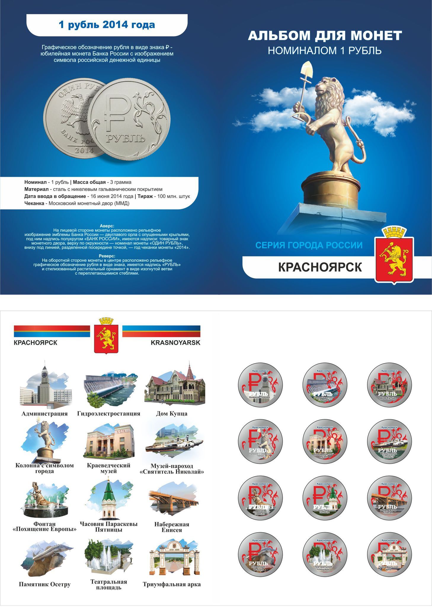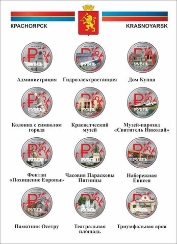 Набор из 12 монет с эмалью "г. Красноярск" номиналом 1 рубль в альбоме.