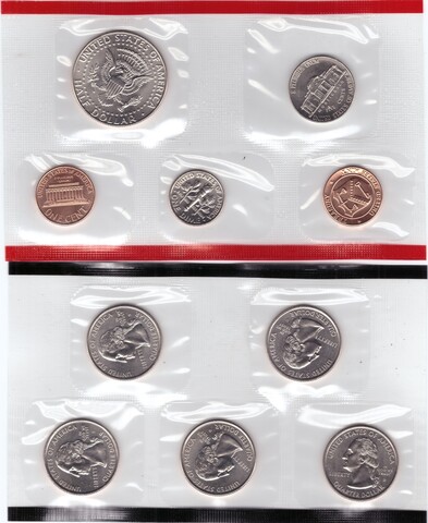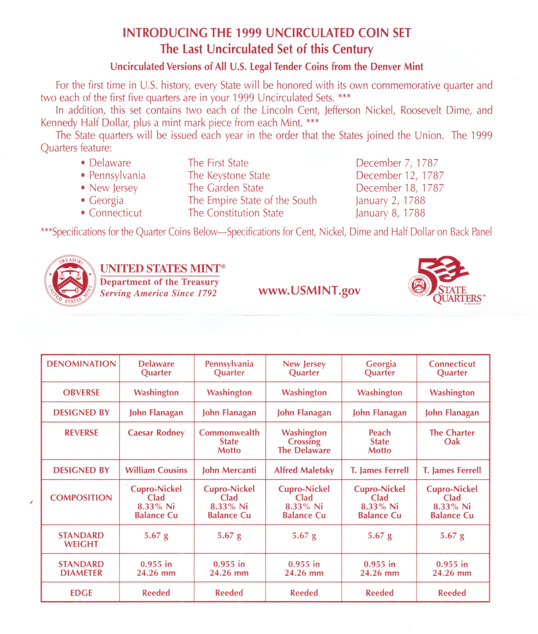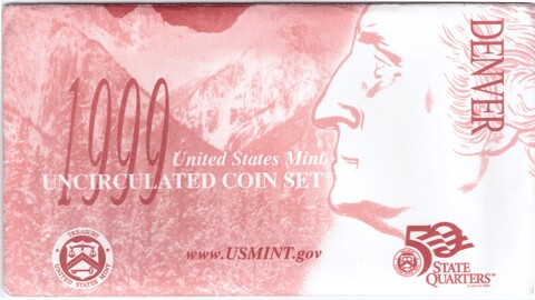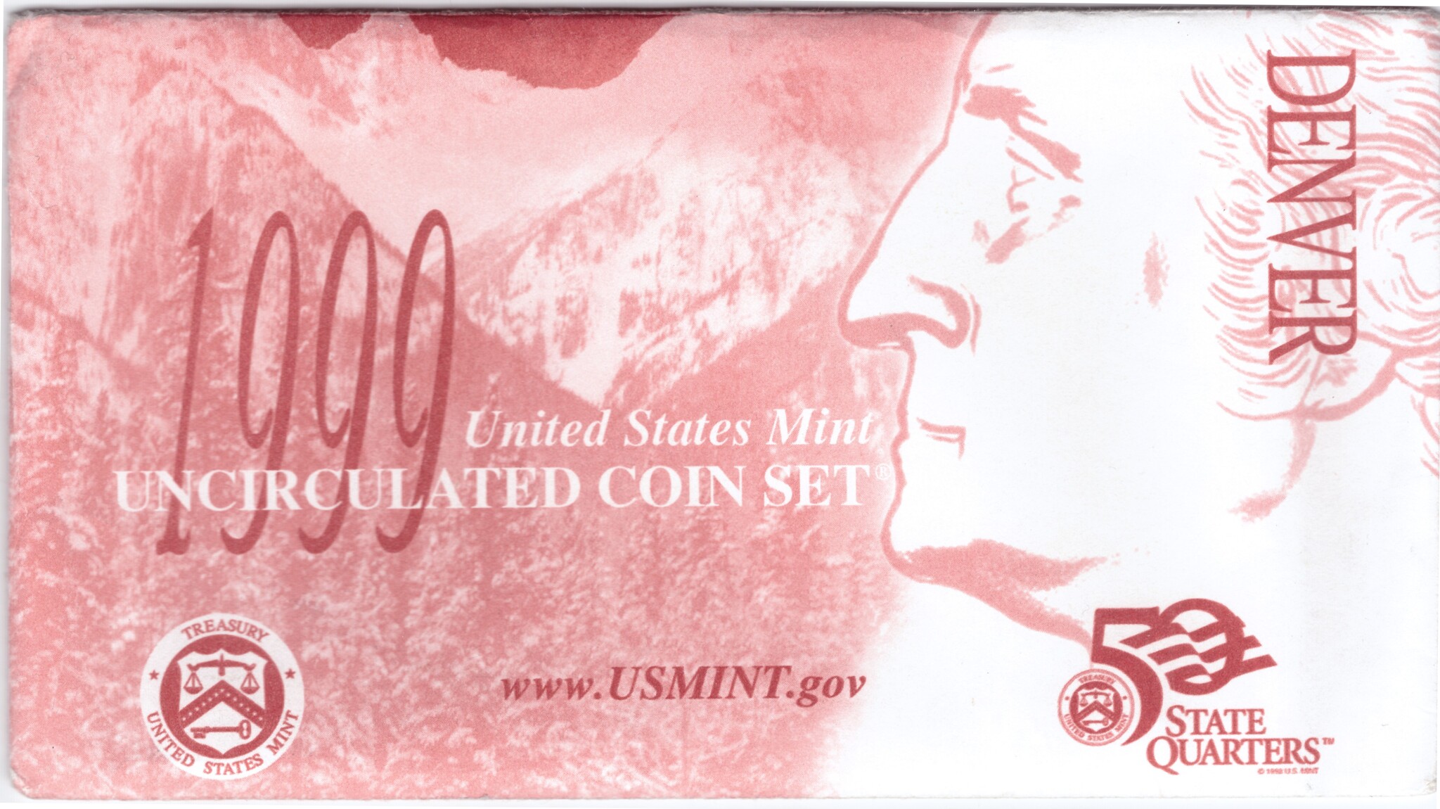 Годовой набор монет США 1999 год. Денвер (D: 4 монеты годовых + жетон; 5 монет 25 центов штаты) в родном конверте. Медно-никель, медь