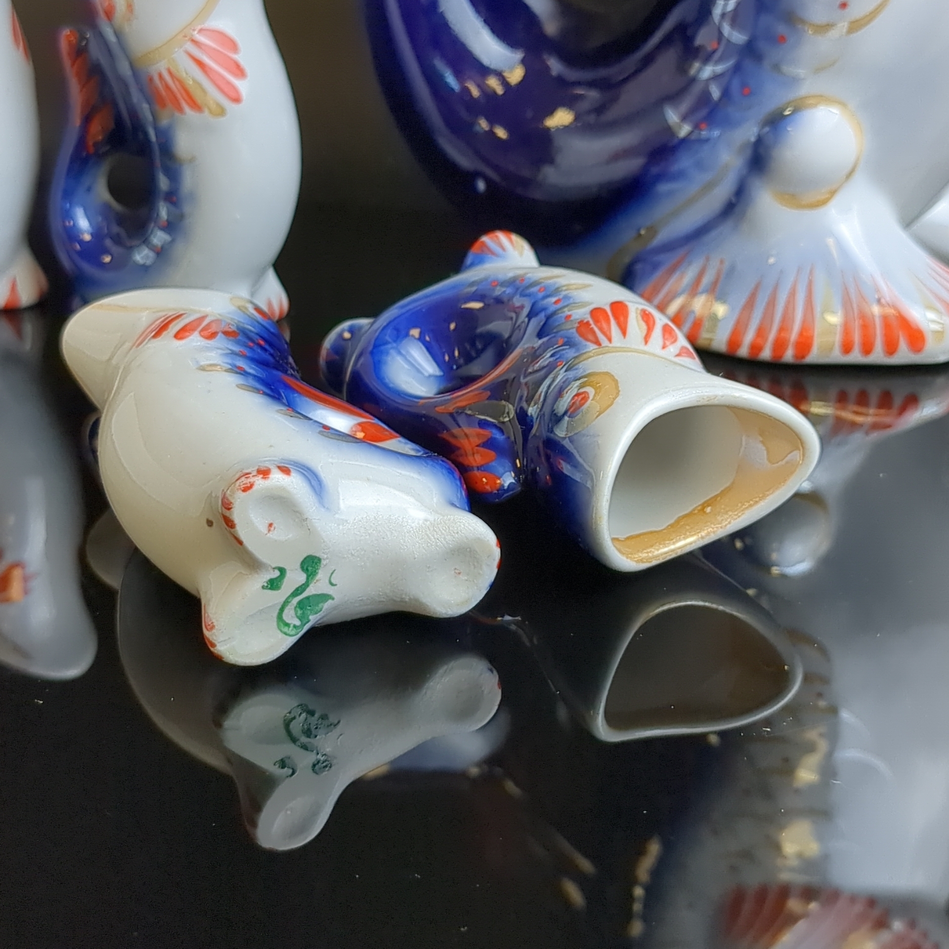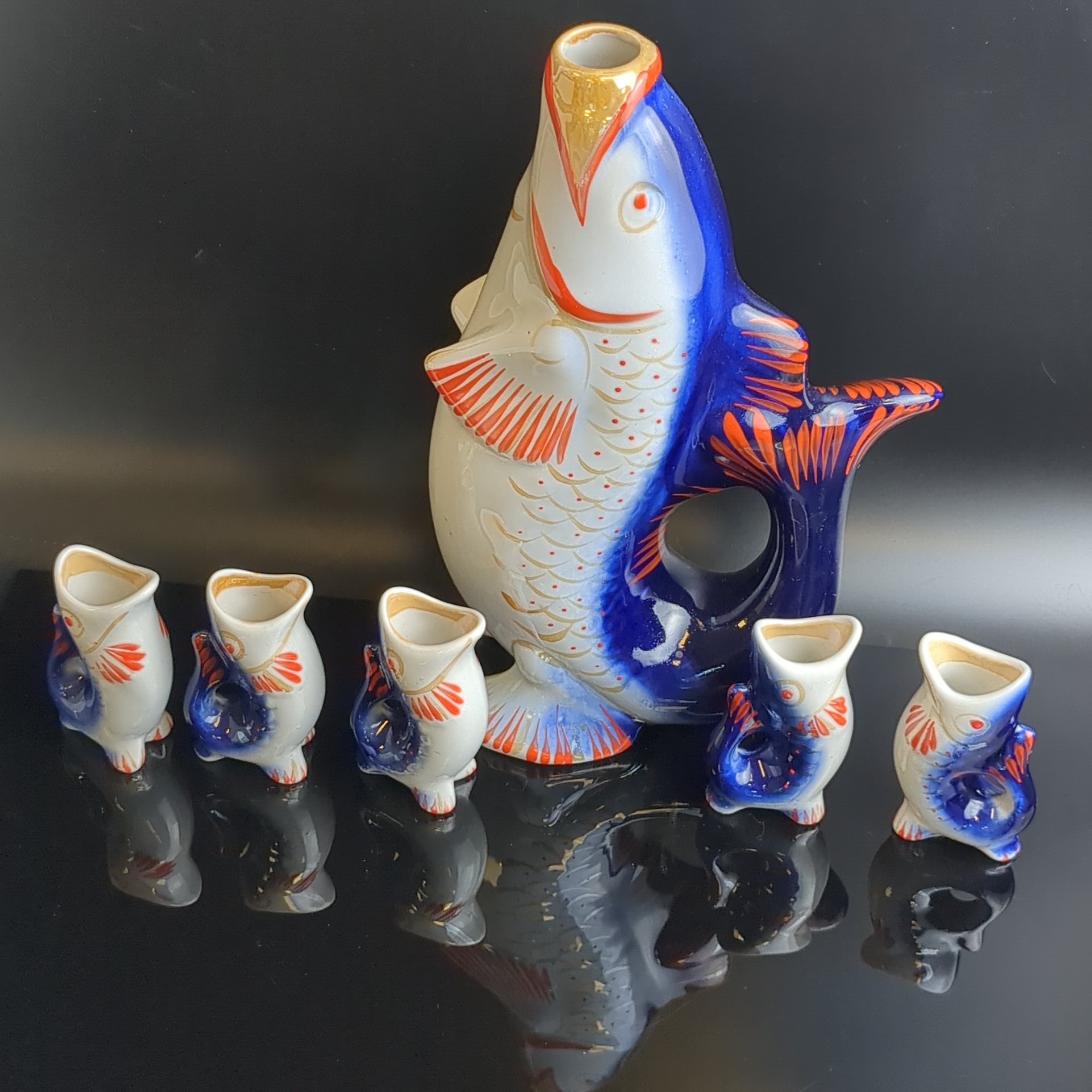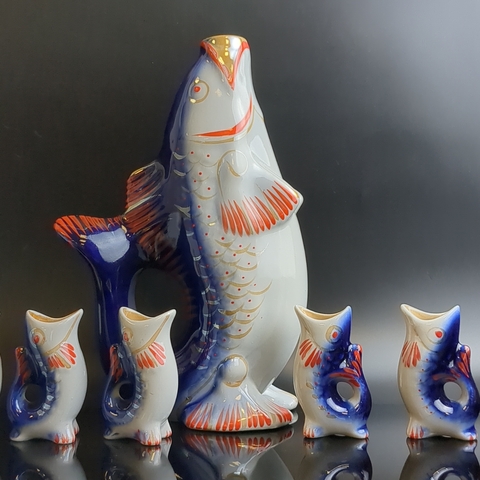 Графин фарфоровый Рыбки с 5 рюмками, стопками, клеймо ЗХК Полонский завод, винтаж,СССР 1970-1990 гг. Без пробки. Высота - 26 см. Состояние на фото