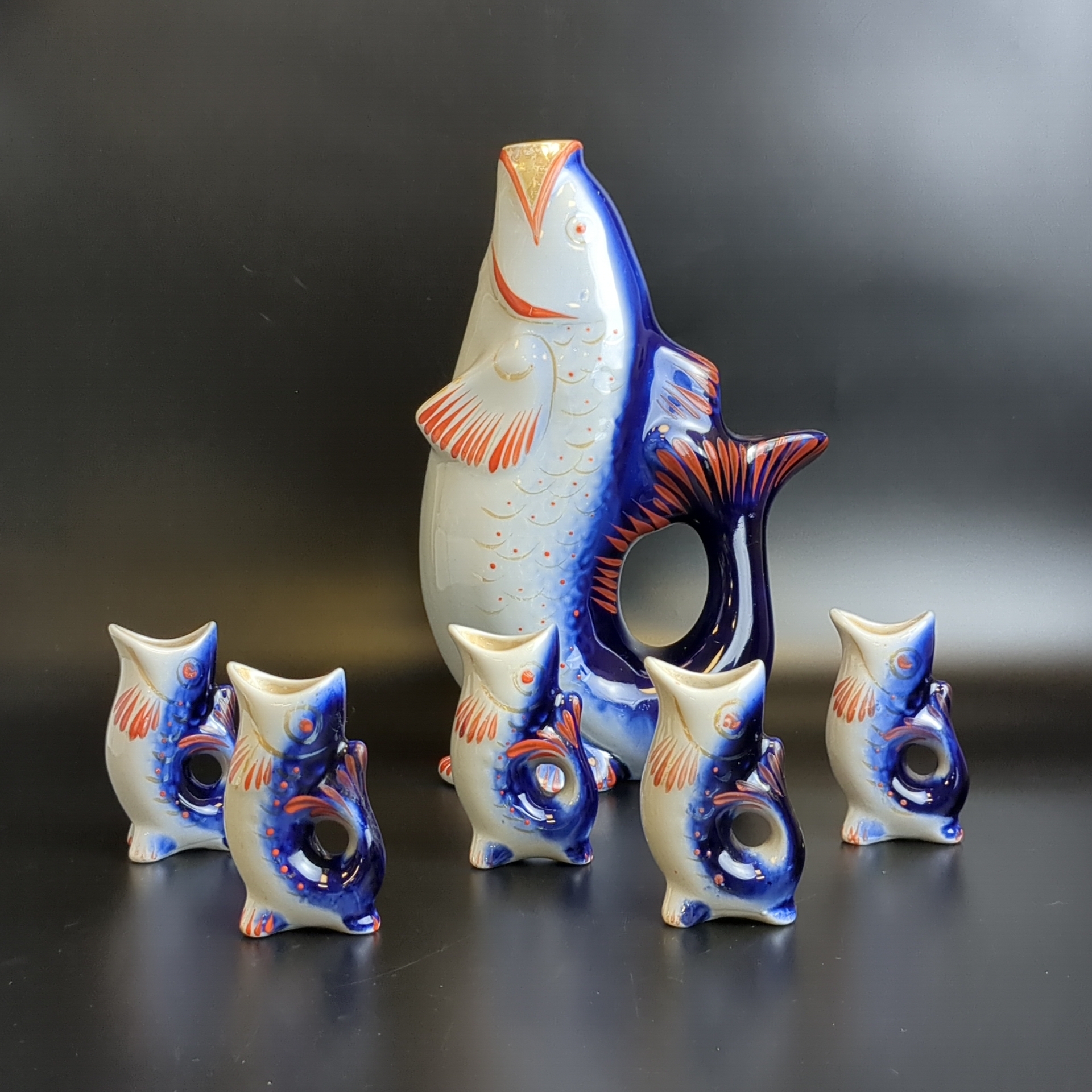 Штоф, графин без пробки! фарфоровый "Рыбки" с 5 рюмками, стопками, комплект, клеймо ЗХК Полонский завод, винтаж, СССР 1970-1990 гг. Высота графина - 26 см, высота стопки- 7.5 см. Состояние на фото. Прекрасный набор на подарок или в личную Коллекцию