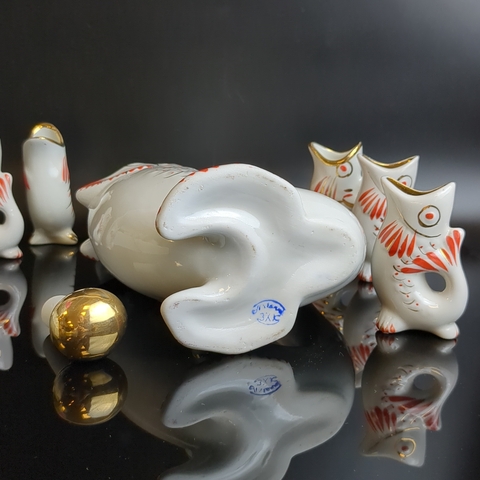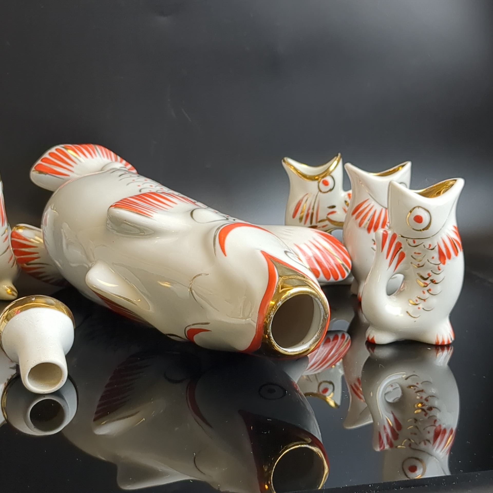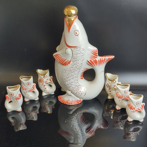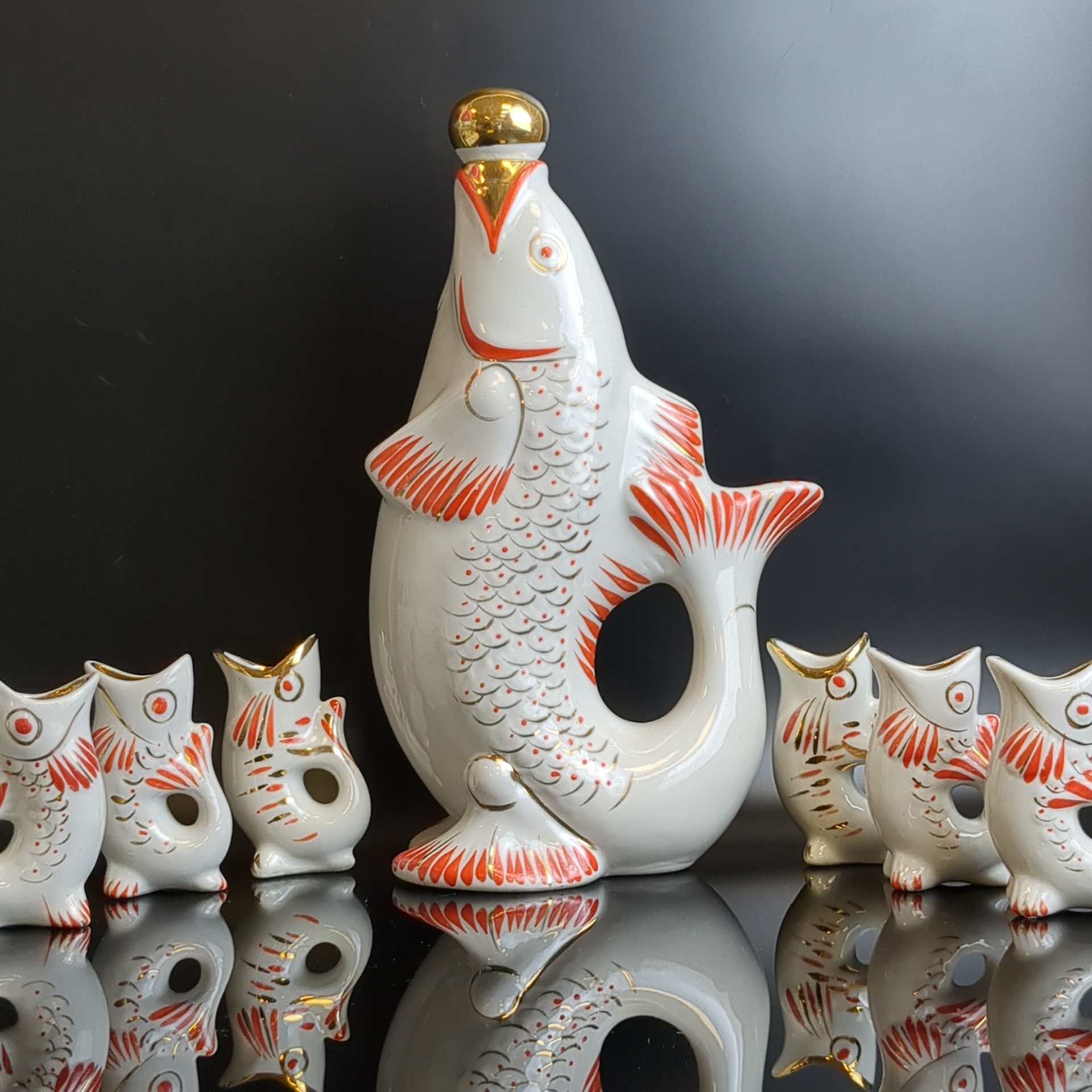 Штоф, графин фарфоровый "Рыбки"/" Рыба" с 5 рюмками, стопками, комплект, клеймо ЗХК Полонский завод, винтаж, СССР 1970-1990 гг. Высота графина - 26 см. Состояние на фото. Прекрасный набор на подарок или в личную коллекцию