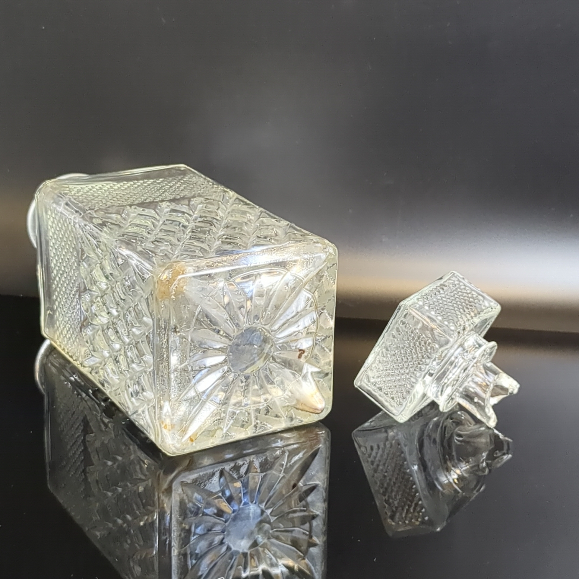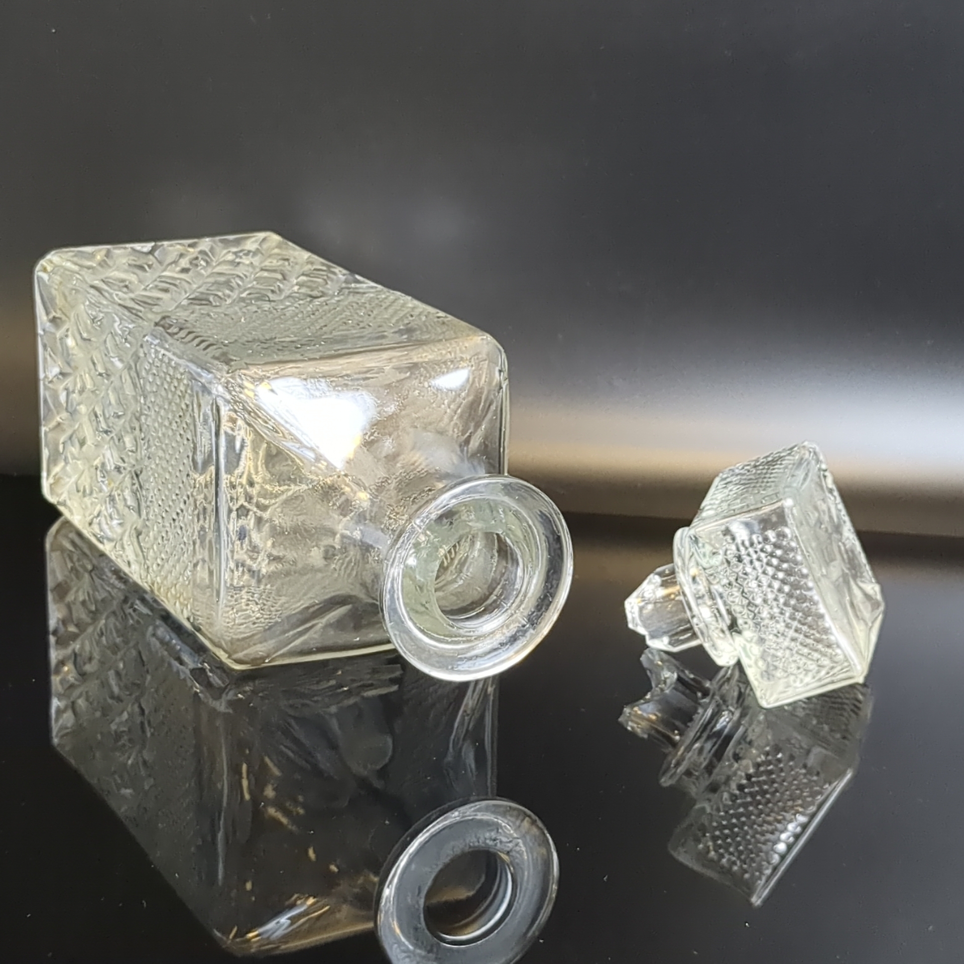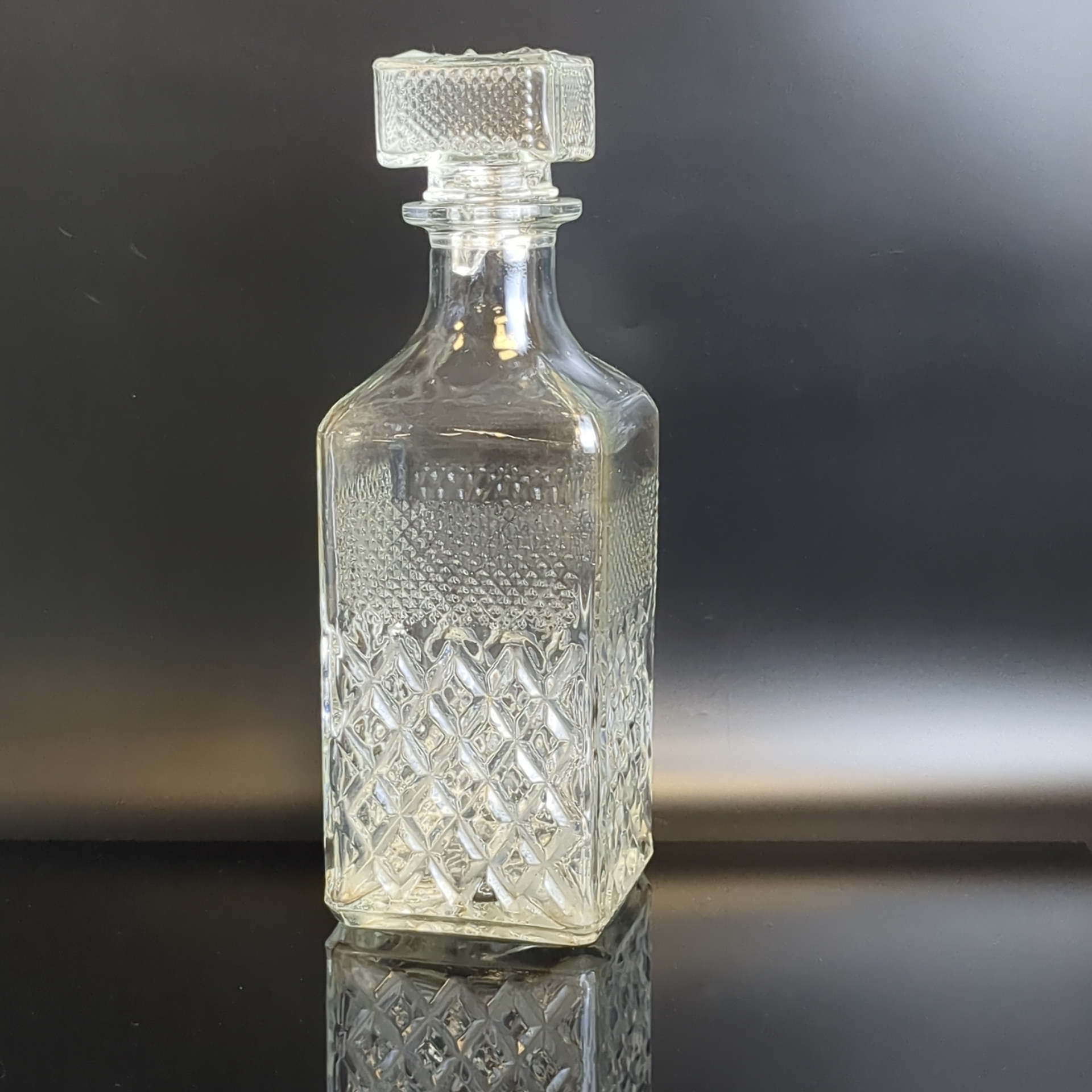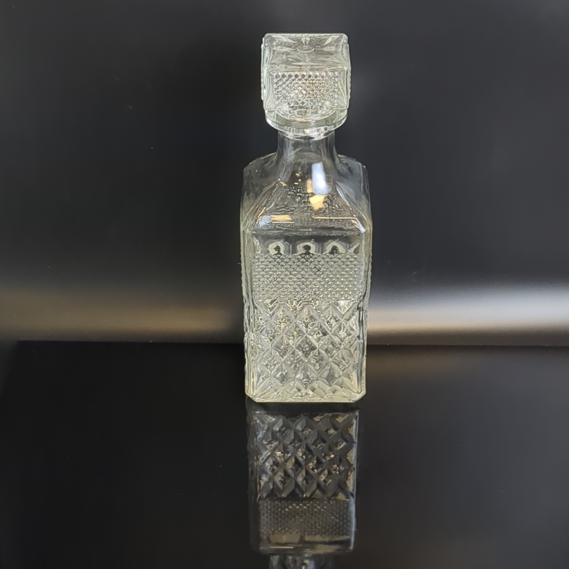 Графин, штоф четырехугольной формы с рельефным геометрическим декором, (объём-? мл), высота- 24 см, стекло, СССР, 1970-1990 гг. Состояние на фото