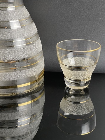 Графин стеклянный винтажный насыпное стекло с одной рюмкой, позолота, СССР 1960-1990 гг. Декор напыление, советское толстостенное стекло. Высота - 21 см. Объем графина - 500 мл , объем стопки-50 мл.