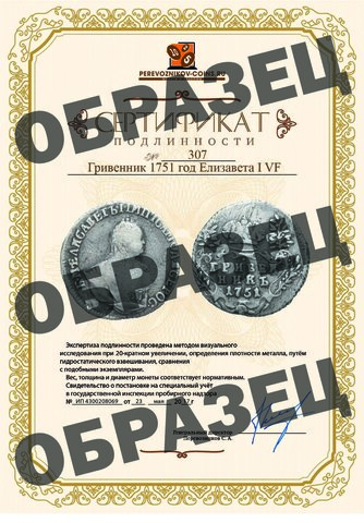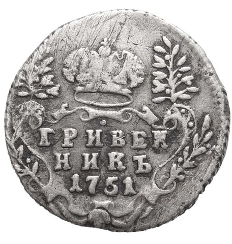Реверс: в центре в фигурном картуше надпись «ГРИВЕН», под ней - «НИК», (гривенник), ниже год чеканки «1751». Картуш увенчан императорской короной.