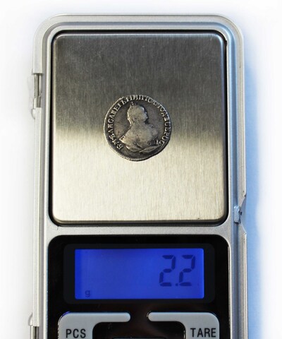 Аверс: в центре обращенный вправо портрет императрицы Елизаветы. Вдоль края надпись «Б.М.ЕЛИСАВЕТА.I:ИМП.ИСАМОД:ВСЕРОС:» (Божьей Милостью Елизавета I Императрица и Самодержица Всероссийская).
