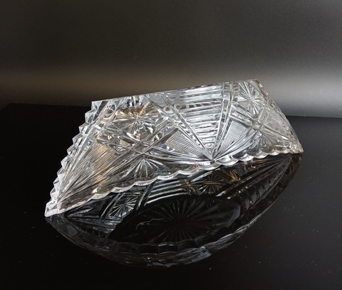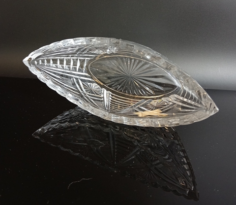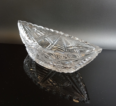 Хрустальный салатник Ладья алмазная грань, геометрический декор, винтаж СССР 1970-1990 гг. Высота - 7 см, длина - 21.5 см. Присутствуют следы использования- состояние на фото.