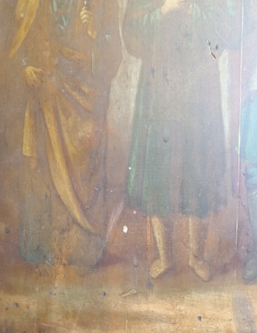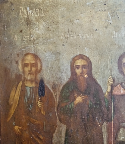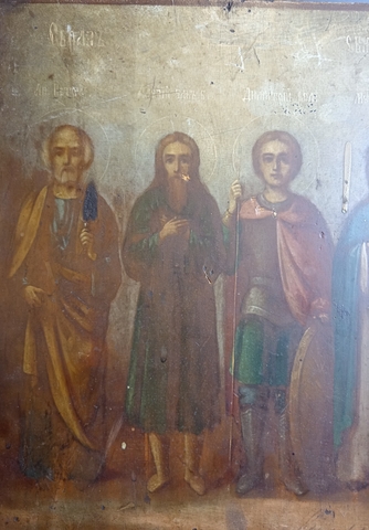 Икона 19 век Четверо Святых. Образ Святых. Апостол Пётр, Димитрий Солунский, Мученица Васса Алонская. Российская империя. Размер иконы 34 х 28,5 х 1,3 см. Две сквозные поперечные шпонки говорят о ее возрасте, такого вида шпонки использовали в 19 веке. Святой апостол Петр отображает образ великого мученика и христианина, который первым прославил Господа Иисуса Христа. Святому Апостолу Петру молятся об укреплении веры, о помощи в искреннем и глубоком покаянии. Святой Апостол Петр исцелил множество людей, поэтому ему молятся об исцелении от тяжких недугов. Дмитрий Солунский великомученик - святой воин, почитаевшийся богатырем и защитником отчего дома, родной земли русской. Дмитрий Солунский покровительствует всем, кто пострадал от вражеских нашествий. Ему молятся о памяти тех, кто пал на поле битвы. День святой Вассы - 3 сентября по новому стилю . Святая Васса – покровительница мореплавателей, ее также почитают верующие, как покровительницу супружества и семейного счастья. Молятся святой Вассе об избавлении от уныния, об излечении душевных и телесных недугов. Присутствуют следы использования. Состояние на фото. Данная икона является культурной и исторической ценностью и не подлежит свободному перемещению через границу Российской Федерации согласно Закону РФ «О вывозе и ввозе культурных ценностей».