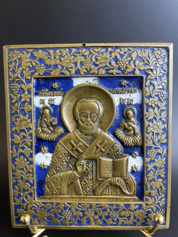 Икона 19 век "Святитель Николай Чудотворец" (Николай Угодник), бронза, литье, полихромные эмали, Российская Империя, 1850-1890 гг.