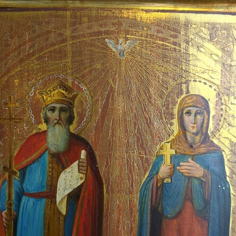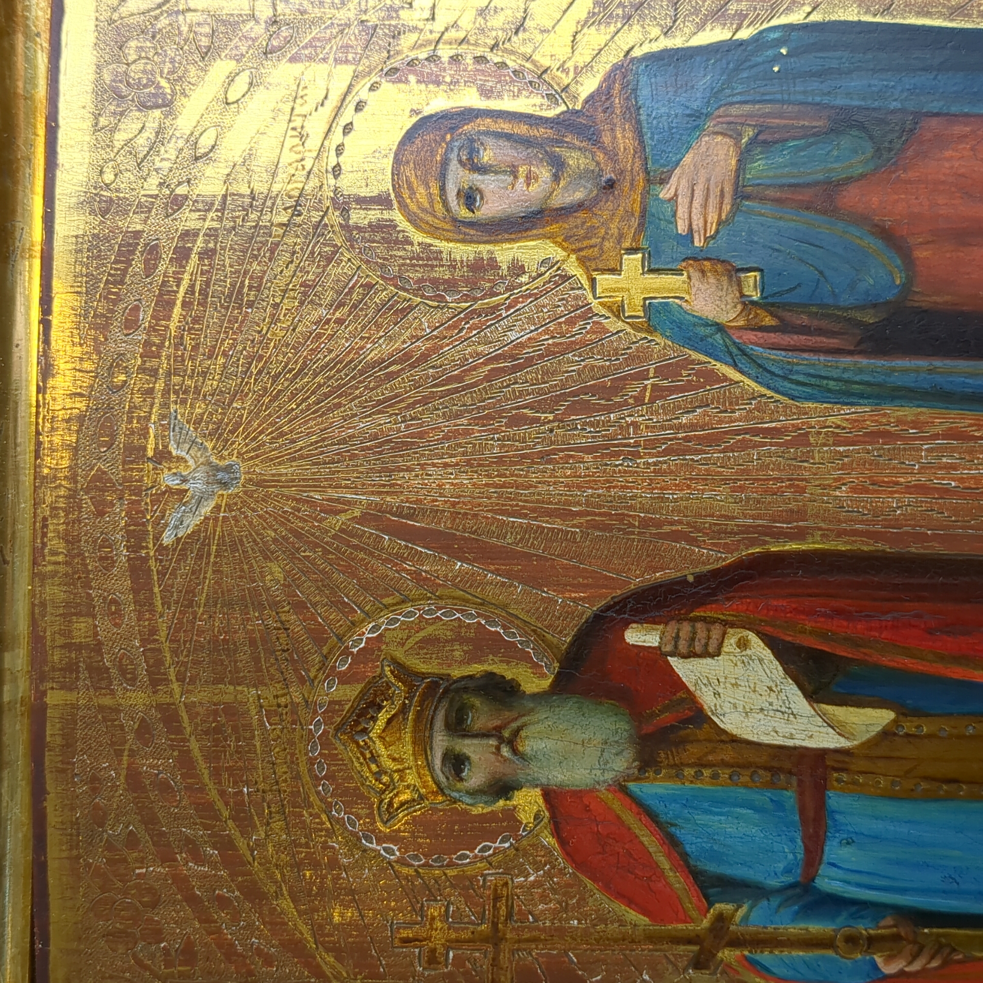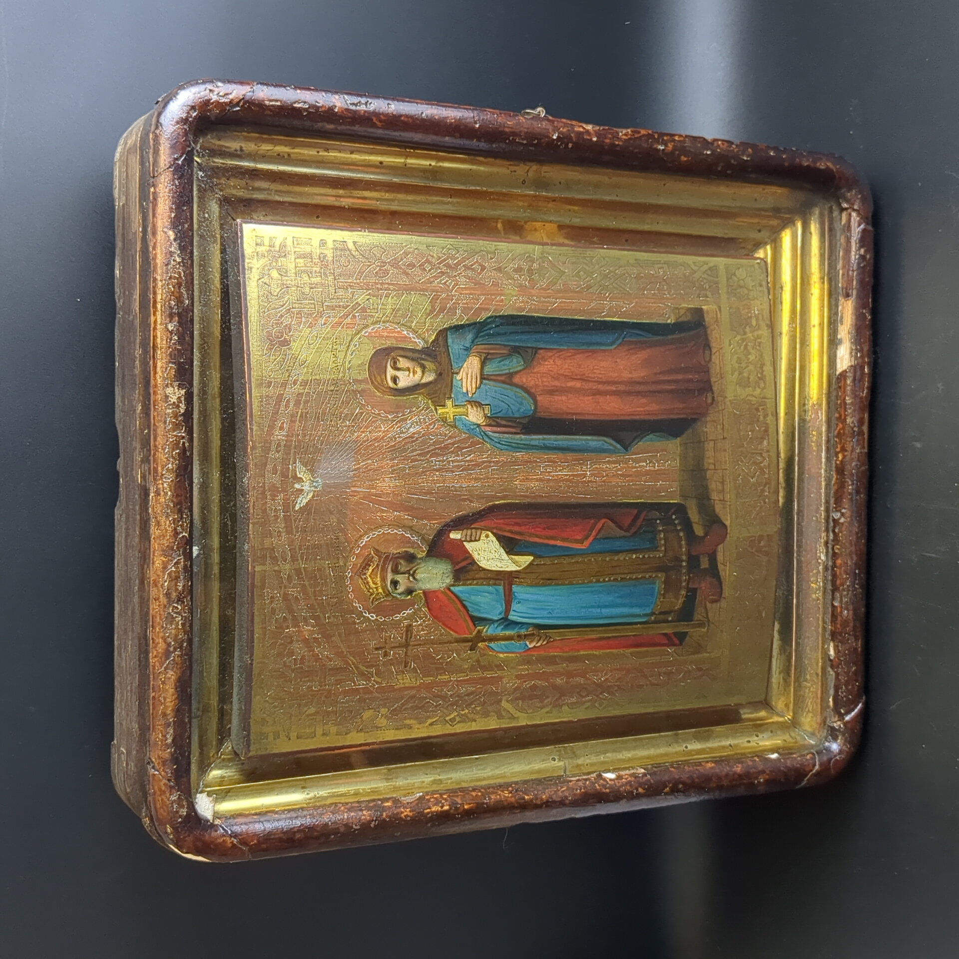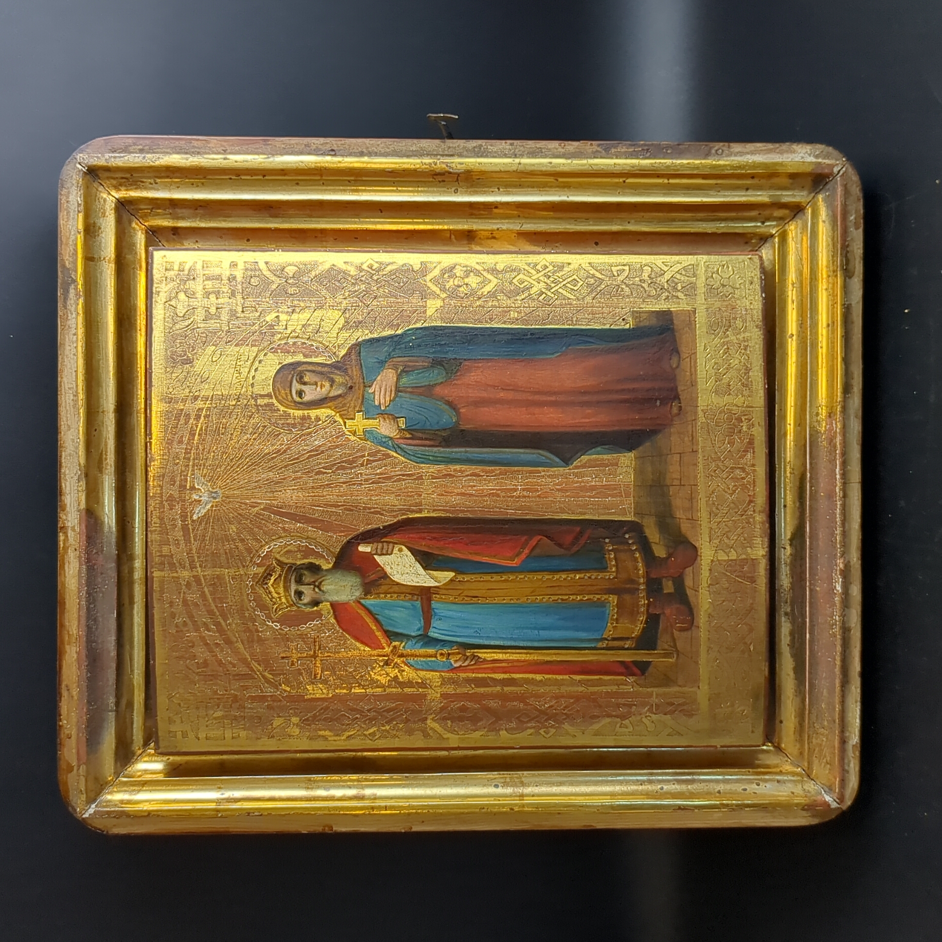 Композиция представляет собой парный образ святых покровителей, что характерно для именных или семейных икон. Такие иконы заказывались в честь небесных покровителей членов семьи и хранились в домашнем красном углу, передавались по наследству как семейная святыня.