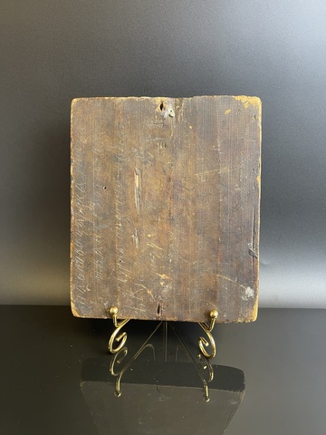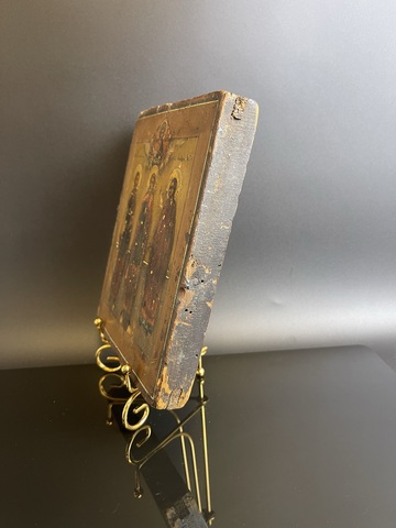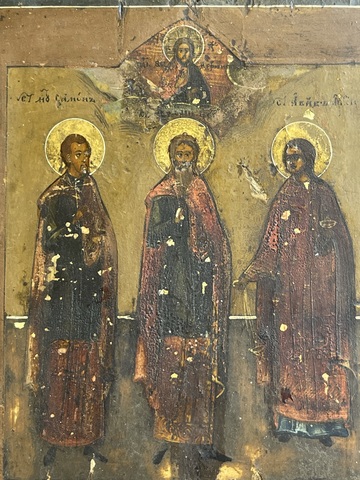 Икона 19 века Святые мученики Гурий, Самон и Авив (хранители домашнего очага) с торцевыми шпонками, дерево, темпера, Российская Империя. Размеры 18 х 15,5 х 2,2 см.