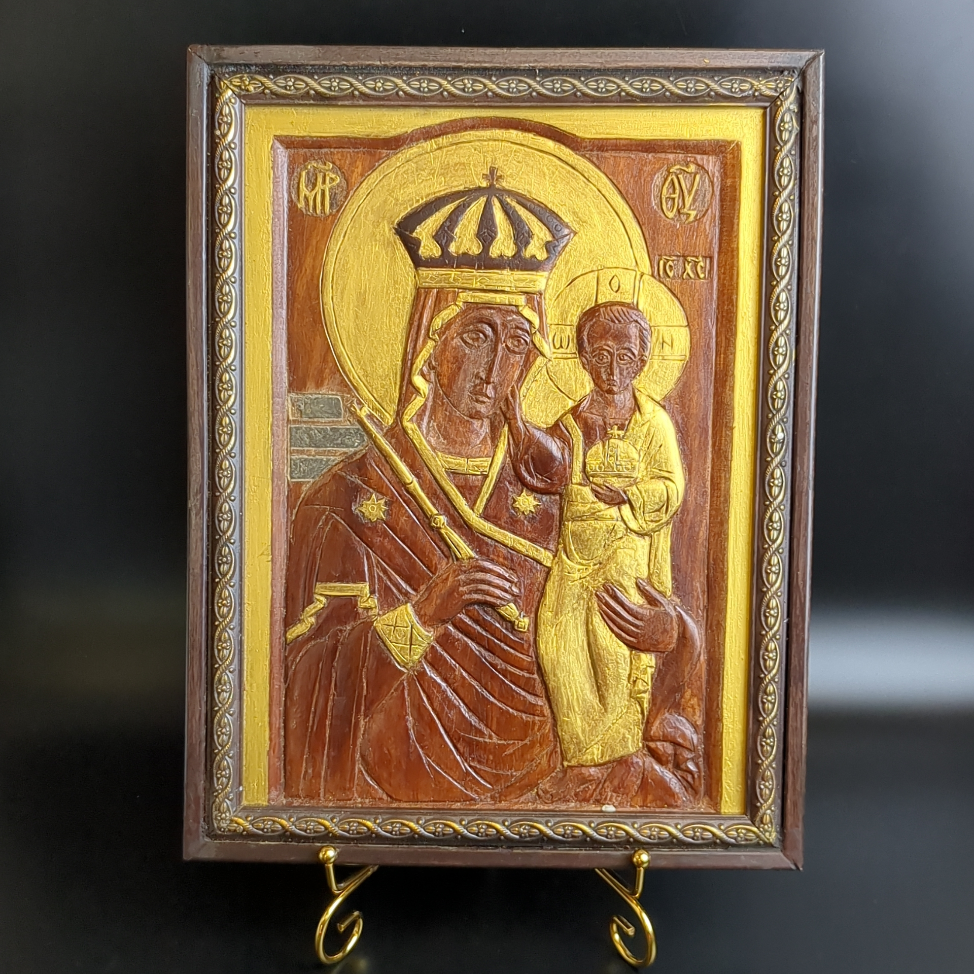 Икона Божией Матери «Призри на смирение». Старинная деревянная резная из красного дерева. Данная икона может нести не только духовную ценность, но и благодаря достойному размеру иконы 34х26х3 см идеально впишется в любой современный интерьер. Резьба по дереву выполнена вручную в 1980-е гг. СССР. Ручная работа. Автор данной работы Салангин Николай Васильвич - художник - иконописец Вятского края, мастер своего дела. Его работы так же находятся в некоторых храмах. Доска красного дерева подобрана таким образом, чтобы кольца располагались в разные стороны, чтобы доска не изгибалась со временем. Резная икона из дерева изготовленна по православным канонам. Призри на смирение – не самый известный образ Пресвятой Богородицы, но он прославился многочисленными чудесами. Молятся данному образу Богородицы как за себя, так и за грешников, не желающих раскаиваться об обретении смирения, покаяния и духовного исцеления. Верующие молятся перед ней о прощении грехов, избавлении от гордыни и укреплении веры. Также, эта икона считается помогающей в исцелении от различных болезней, особенно сердечно-сосудистых и женских, а также в решении жилищных вопросов и защите от клеветы.