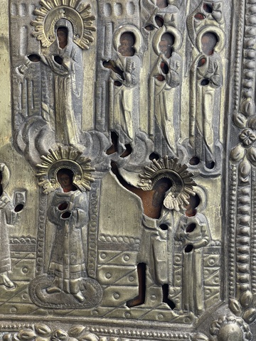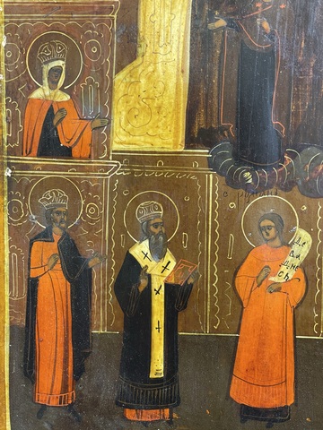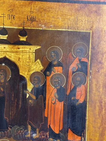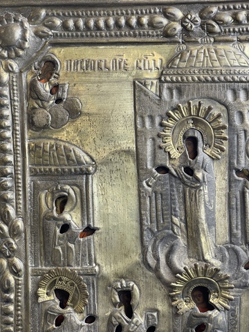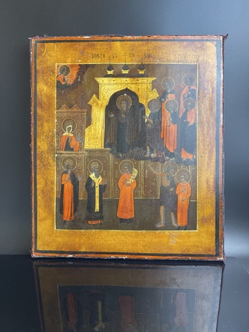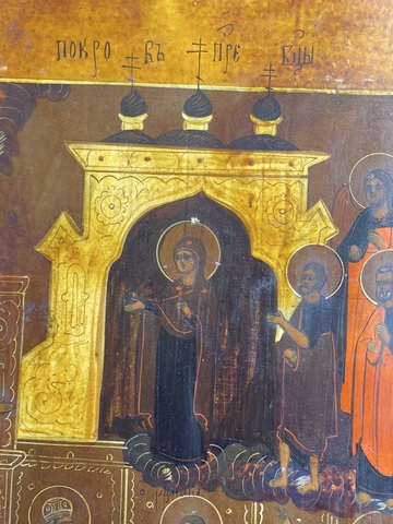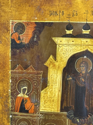 Икона Покров Пресвятой Богородицы в окладе, дерево, темпера, ткань, Российская империя 19 век. Размер иконы 36 х 31,5 х 2,8 см. Покров Пресвятой Богородицы – особый и чтимый в русском православии, церковный праздник. В русской православной традиции празднование праздника Покрова происходит осенью, 14 октября по новому стилю и совпадает с окончанием летних сельскохозяйственных работ. Покров – это момент встречи осени с зимой, часто на этот день уже лежал на земле первый снег, начинали топить печи в домах. Образ Пресвятой Богородицы, распростершей Свой покров над всеми верующими христианами всегда был почитаем, как защитный, иконе Покров Пресвятой Богородицы посвящали свои молитвы о спасении и защитной помощи в любых житейских делах. Молятся иконе Покрова Пресвятой Богородицы о защите от всяких врагов, об окончании любой вражды. С лева на одном венце есть нюанс, не закреплен на второй гвоздь. Данная икона является культурной и исторической ценностью и не подлежит свободному перемещению через границу Российской Федерации согласно Закону РФ «О вывозе и ввозе культурных ценностей».