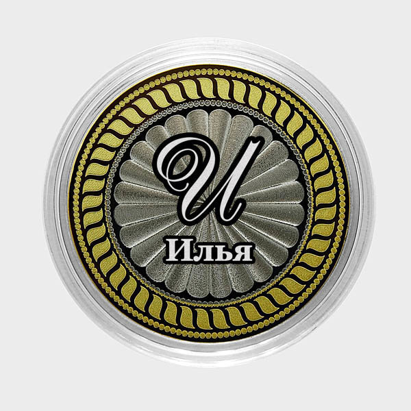 Сувенирная монета "Илья" номиналом 10 рублей с выгравированным изображением.