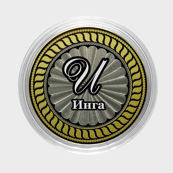 Сувенирная монета "Инга" номиналом 10 рублей с выгравированным изображением.