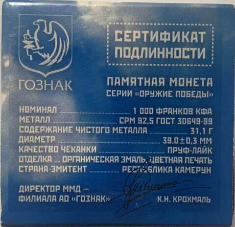 Камерун 1000 франков (FRANCS CFA) 2020 ММД "Оружие победы - Пушка ЗИС-3" в боксе с сертификатом (Proof)