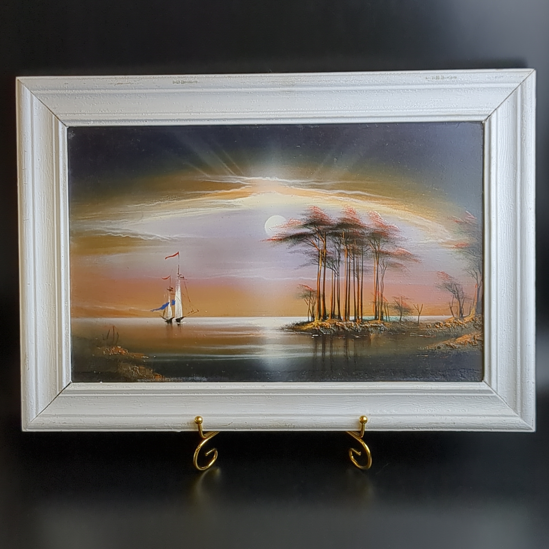 Картина маслом, живопись "Сочи" - Владимир Бабич 1998 год. Размер картины 47 х 32,7 см с учётом рамы. Очень тонкая и обёмная работа с рельефным выступающим пейзажем. Два парусных корабля подходят к причалу под светом луны. Владимир Бабич Родился в 1953 году в Краснодаре. В 1981 г. – Окончил МХПА имени С.Г. Строгонова. Московская государственная художественно-промышленная академия - одно из старейших художественных учебных заведений России.