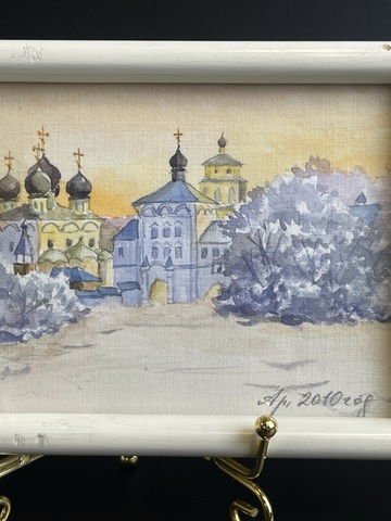 Картина Трифонов Монастырь Успенский Собор г. Вятка 2010 год . Художник Арасланов Р.Н. Акварель. Размеры 10см х 15 см без учета рамки. Ренат Нуруллович Арасланов 1948 г.р. Является членом профессионального союза художников, членом творческого союза художников России и Международной федерации художников (с 2002 года). С 1992 года, художник принимал участие в различных городских и областных выставках. В сентябре 2007 г. Р.Н. Арасланов Р.Н. стал одним из участников выставки «Земля Вятская», которая экспонировалась в Государственной Думе Российской Федерации в Москве. С 2013 по 2016 гг. проходили персональные выставки художника в г. Киров, Слободской, Кирово-Чепецк. Картины художника Арасланова хранятся в частных коллекциях страны и за рубежом.Он считается одним из лучших современных худодников г. Кирова