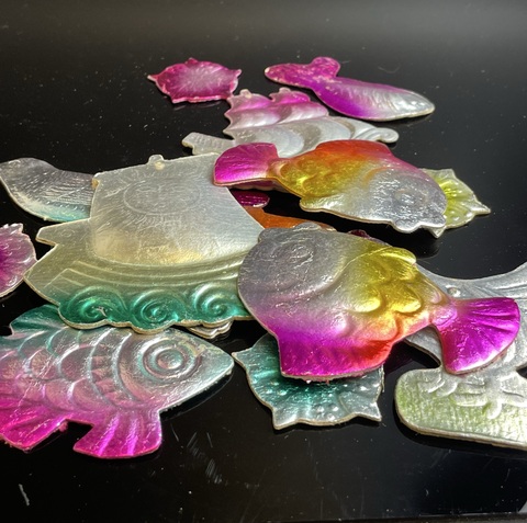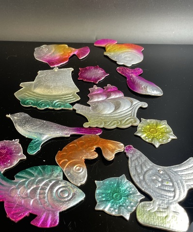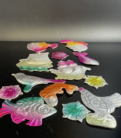 Картонаж набор из 13 штук ёлочных игрушек из картона советского времени, рыбки, парусники, курочка, винтаж СССР 1960-1980 гг