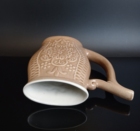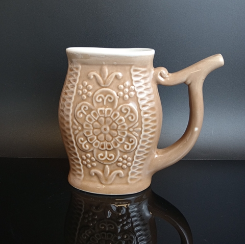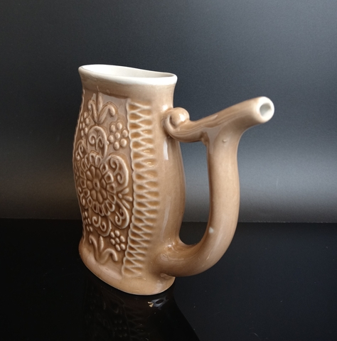 Из белой глины. Плавный, с утолщением по середине силуэт, в сечении - вытянутый овал. Носик длинный, от верхнего и нижнего краев, одинаковый по всей ширине, Г-образный, соединяющийся в верхней части завитком. Вся поверхность тулова украшена рельефным орнаментом. В центре - крупный цветок, окаймленный четырьмя маленькими, с боков от которых - вертикальные орнаментированные полосы. Снаружи кружка покрыта светло-коричневой глазурью, внутри - белой.