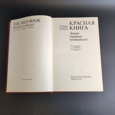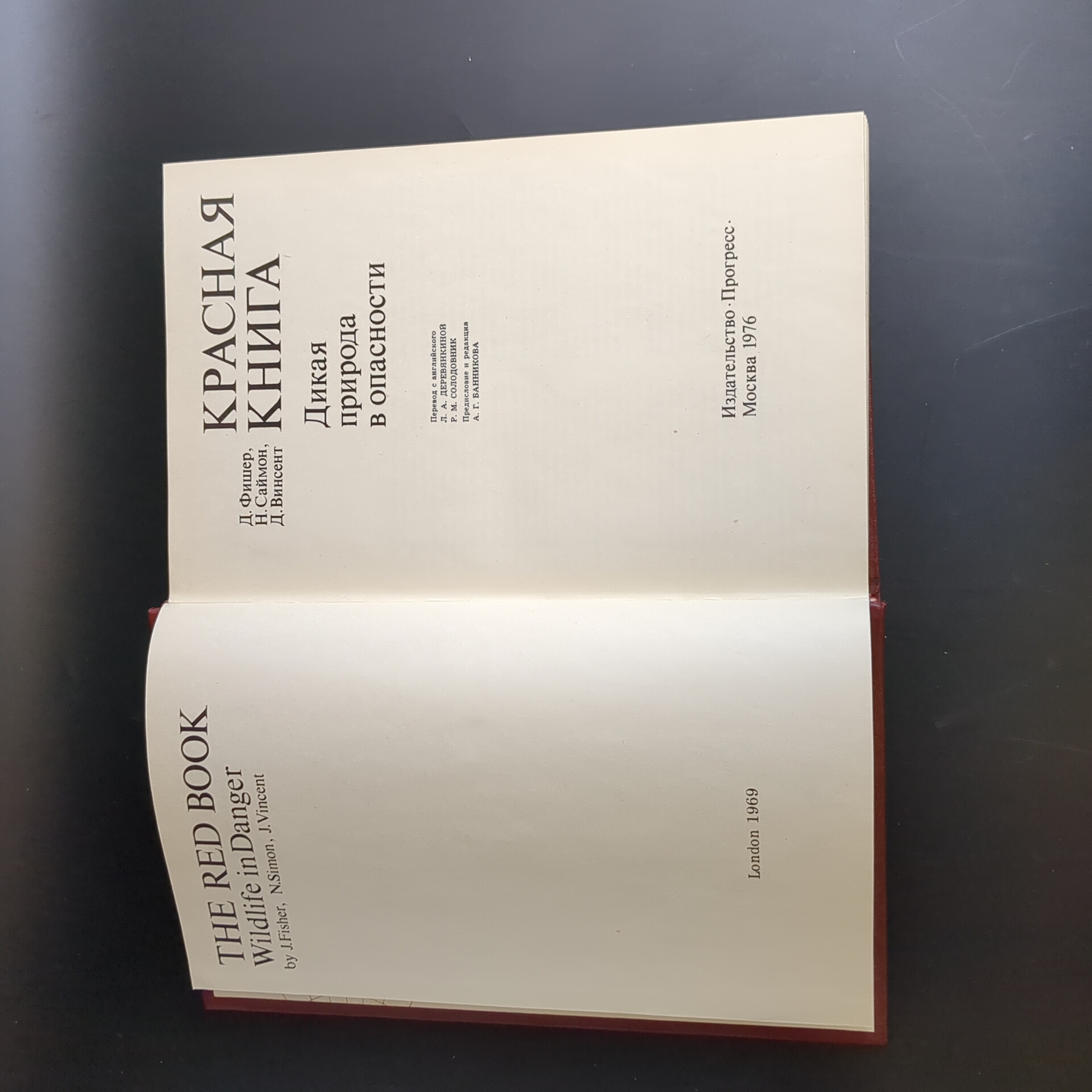 Книга Красная книга - Дикая природа в опасности. Д. Фишер, Н. Саймон, Д. Винсент. Прогресс Москва 1976 год СССР. Книга представляет собой фундаментальный обзор мирового списка редких и исчезающих видов животных и растений, составленного Международным союзом охраны природы (МСОП). В книге подробно рассказывается о возникновении идеи «Красной книги» (Red Data Book) и деятельности Комиссии по редким видам МСОП. Авторы приводят сведения о биологии, ареалах обитания и причинах сокращения численности сотен видов млекопитающих, птиц, рептилий, амфибий и рыб, а также высших растений. Описания разделены по классам животных и включают такие знаменитые примеры, как амурский тигр, калифорнийский кондор, гигантская черепаха и другие виды, находившиеся на грани вымирания в 1970-х годах. Научно-популярный стиль: Несмотря на документальную точность и опору на научные отчеты МСОП, книга написана живым, доступным языком, что сделало её значимым просветительским трудом в области экологии в СССР