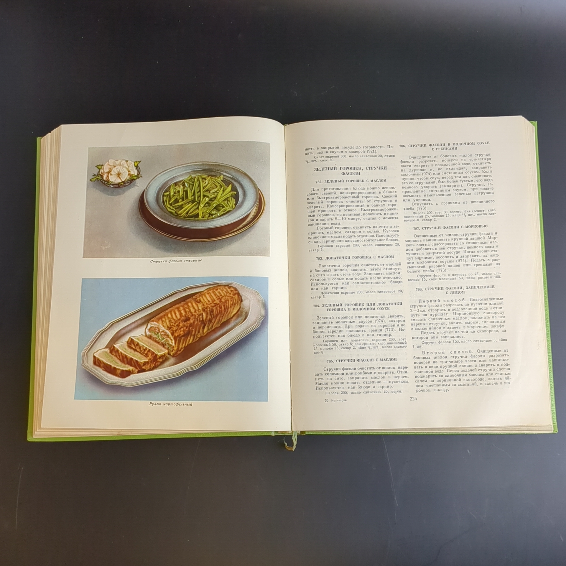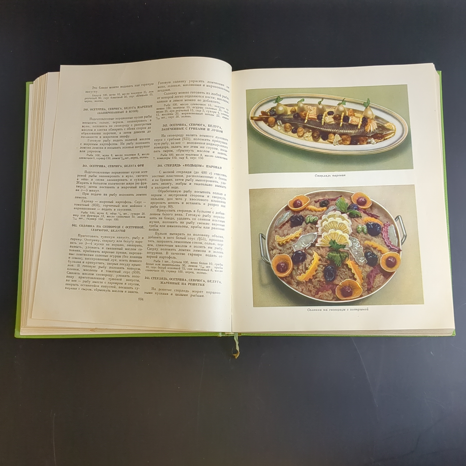 Книга Кулинария, Госторгиздат, бумага, печать, СССР, 1959 г. Книга «Кулинария» 1959 года от Госторгиздата представляет собой универсальный иллюстрированный справочник, который изначально предназначался для поваров предприятий общественного питания, но стал очень популярным среди домохозяек. Книга содержит рецептуры блюд и кулинарных изделий, которые можно приготовить как на предприятиях общепита, так и в домашних условиях. Рецепты сгруппированы в отдельные разделы: Холодные блюда: различные закуски и салаты. Супы: рецепты первых блюд. Вторые блюда: основные горячие блюда. Сладкие блюда: десерты. Изделия из теста: выпечка. Иллюстрации: Текст сопровождается красочными иллюстрациями и фотографиями, а также чертежами оборудования пищевой промышленности. Кухни народов СССР: Отдельные разделы посвящены национальным кухням союзных республик. Сервировка: Приводятся примеры сервировки стола. Объем: Издание 1959 года (под редакцией А. А. Кагановой) представляет собой сокращенную и исправленную версию первого издания 1955 года и насчитывает около 404 страниц. Предназначение: Изначально книга создавалась как основное пособие для поваров, чтобы помочь им в работе и обучить основам кулинарии, но благодаря своей полноте и доступности стала культовой и желанной для многих советских семей. Присутствуют следы использования. Состояние на фото