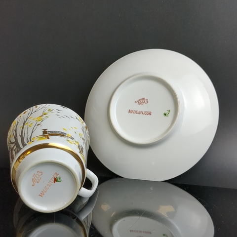 Кофейная пара "Листопад", "Осень", костяной фарфор клеймо ЛФЗ, сложная композиция, 150 мл., декор, золочение, СССР 1970-1990 гг