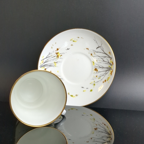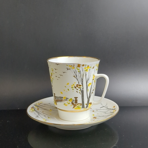 Кофейная пара "Листопад", "Осень", костяной фарфор клеймо ЛФЗ, сложная композиция,  150 мл., декор, золочение, СССР 1970-1990 гг.