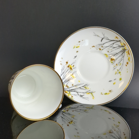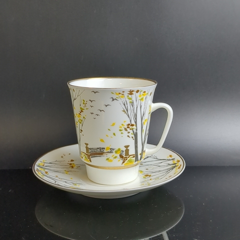 Кофейная пара "Листопад", "Осень", костяной фарфор клеймо ЛФЗ, сложная композиция,150 мл., декор, золочение, СССР 1970-1990 гг.