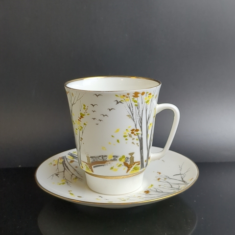 Кофейная пара "Листопад", "Осень", костяной фарфор клеймо ЛФЗ, сложная композиция, 150 мл., декор, золочение, СССР 1970-1990 гг.