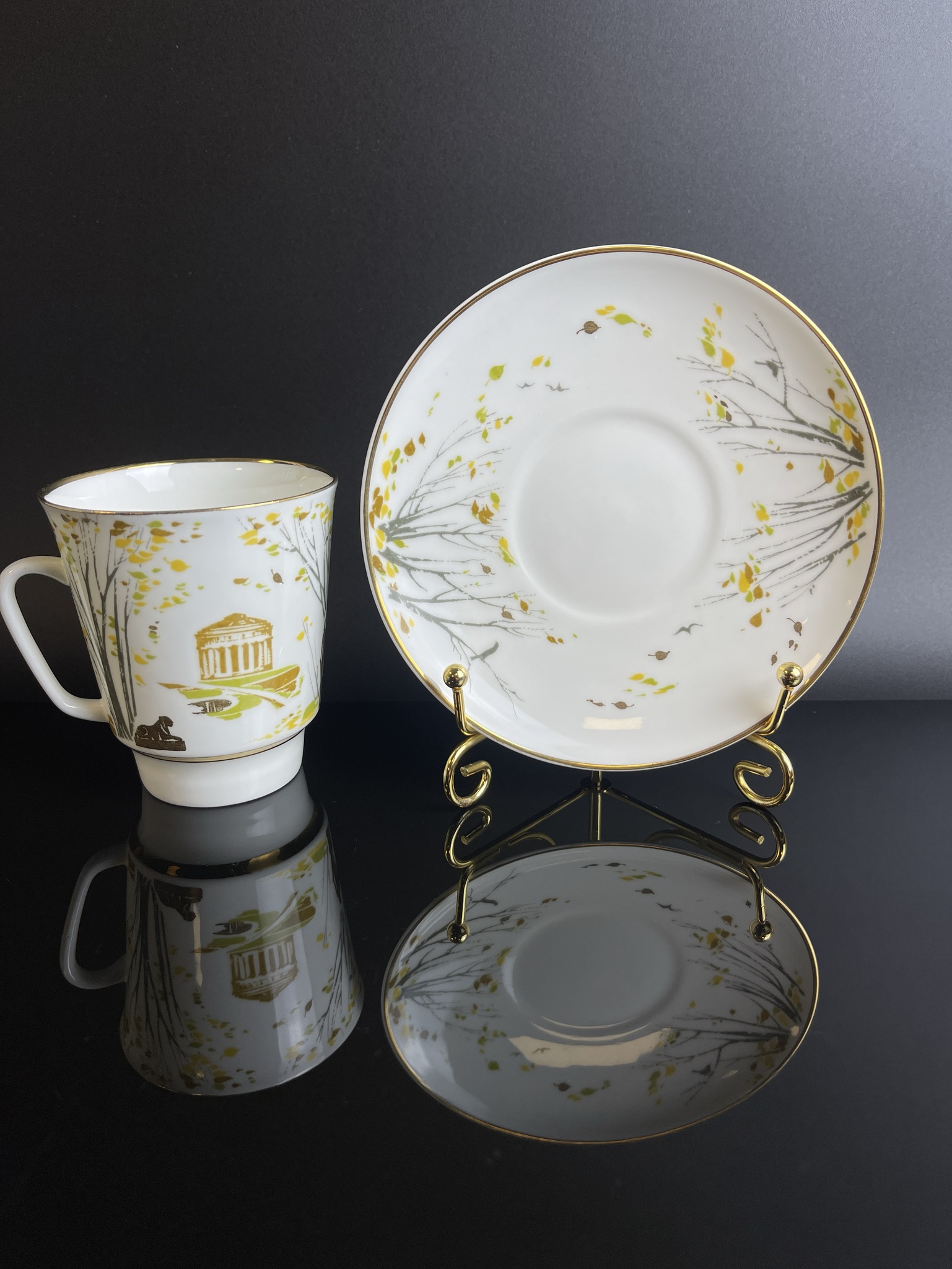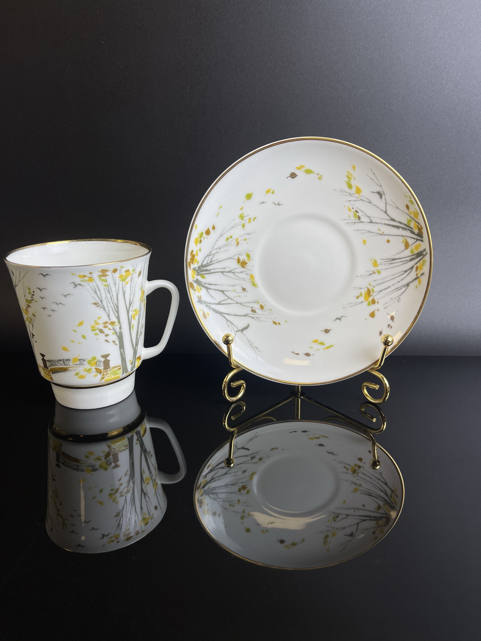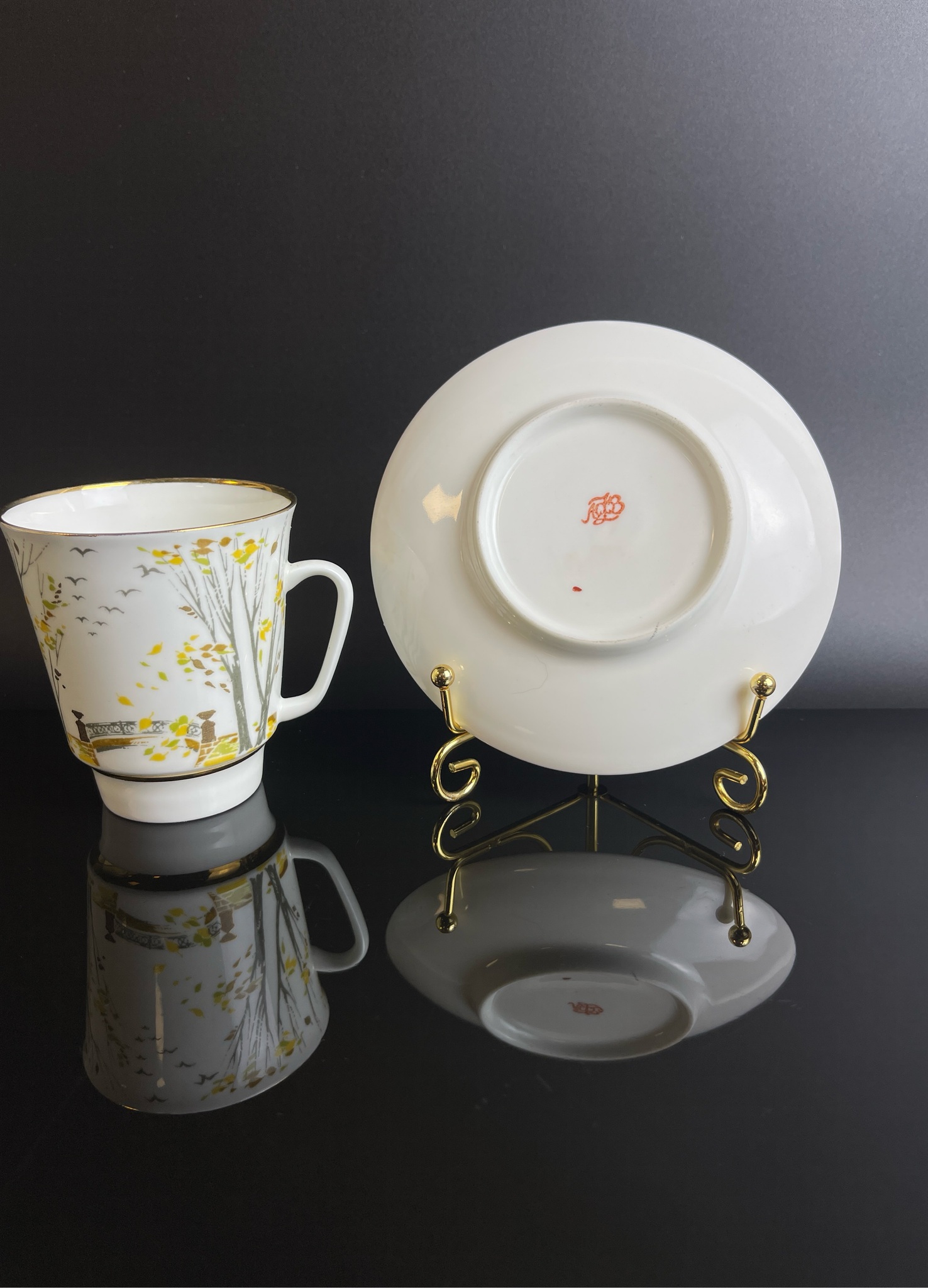 Кофейная пара "Листопад", "Осень", костяной фарфор клеймо ЛФЗ, ВНЕ ГР высший сорт, сложная композиция, декор, золочение, СССР 1970-1990 гг.
