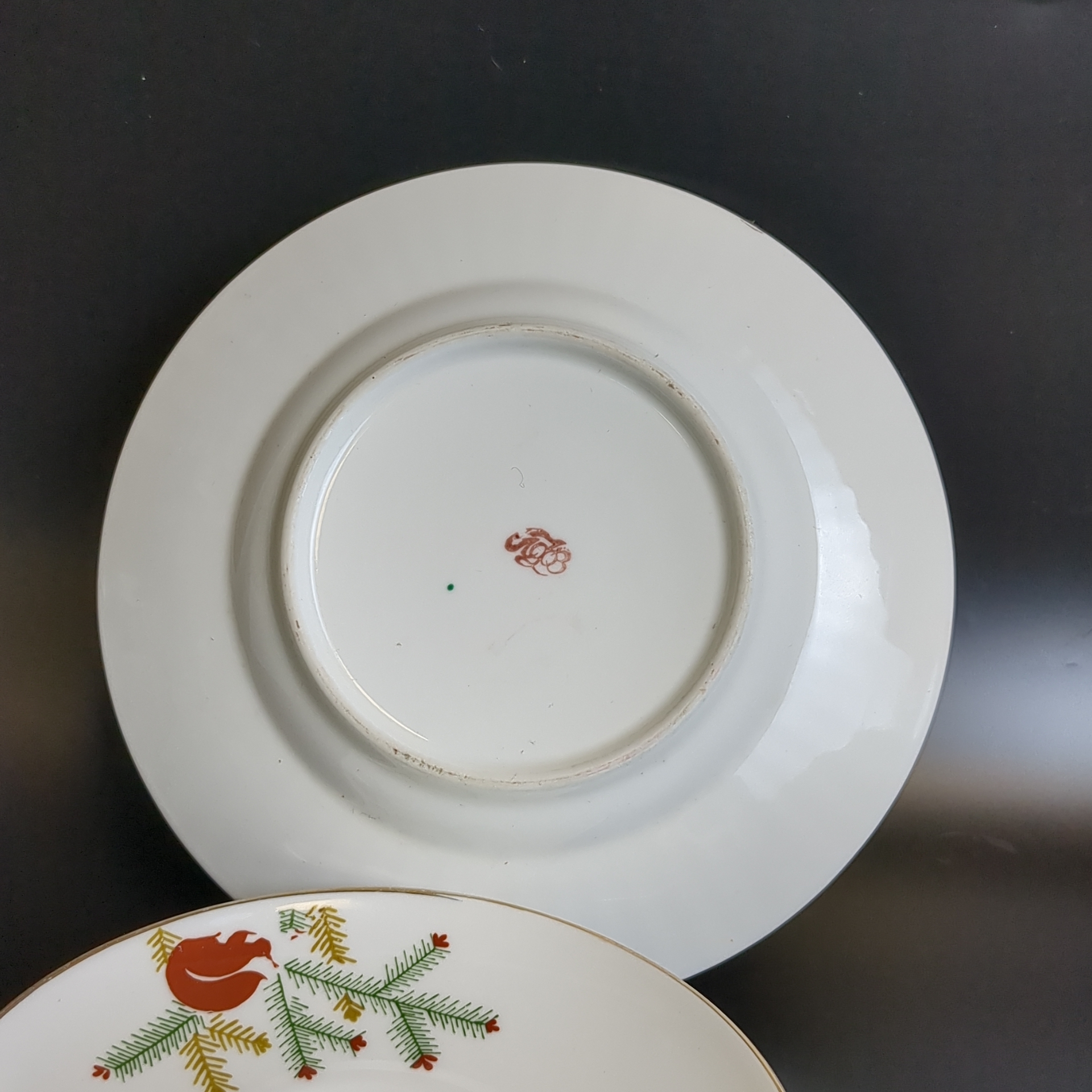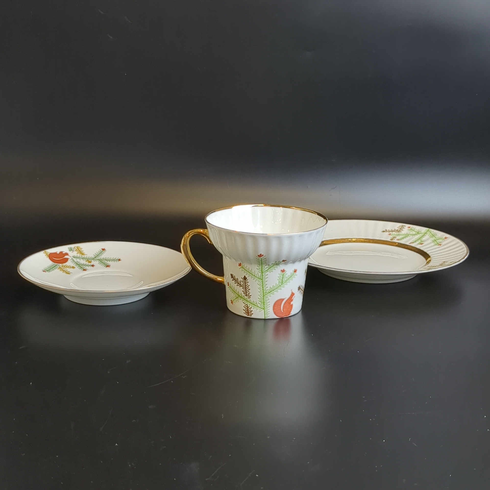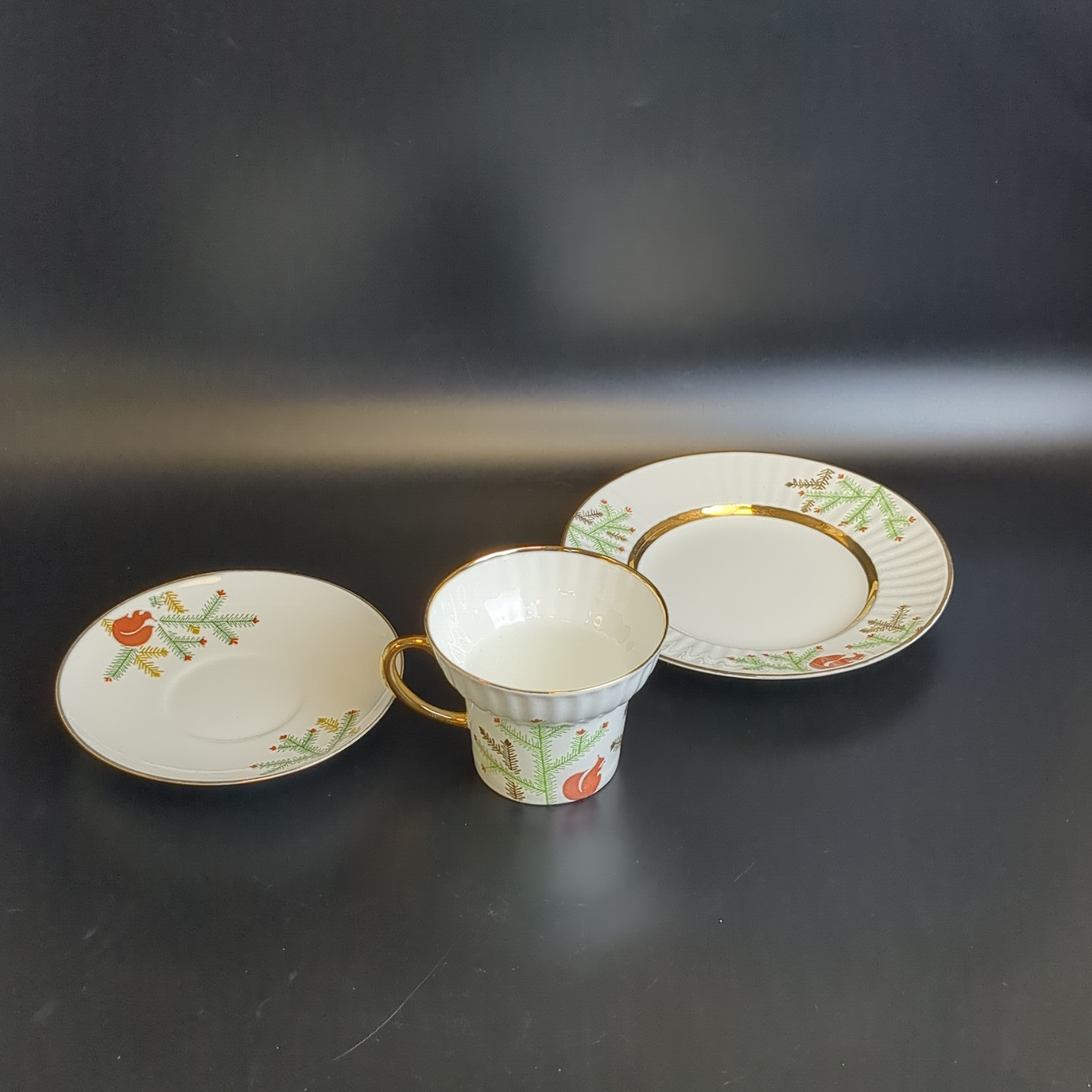 Кофейное трио из костяного фарфор "Белочка на ветке" форма "волна", клеймо на чашечке ВНЕ ГР, ЛФЗ (Ленинградский Фарфоровый Завод), автор росписи Н.Славина, скульптор Э.М.Криммер, винтаж СССР 1970-1991 гг.