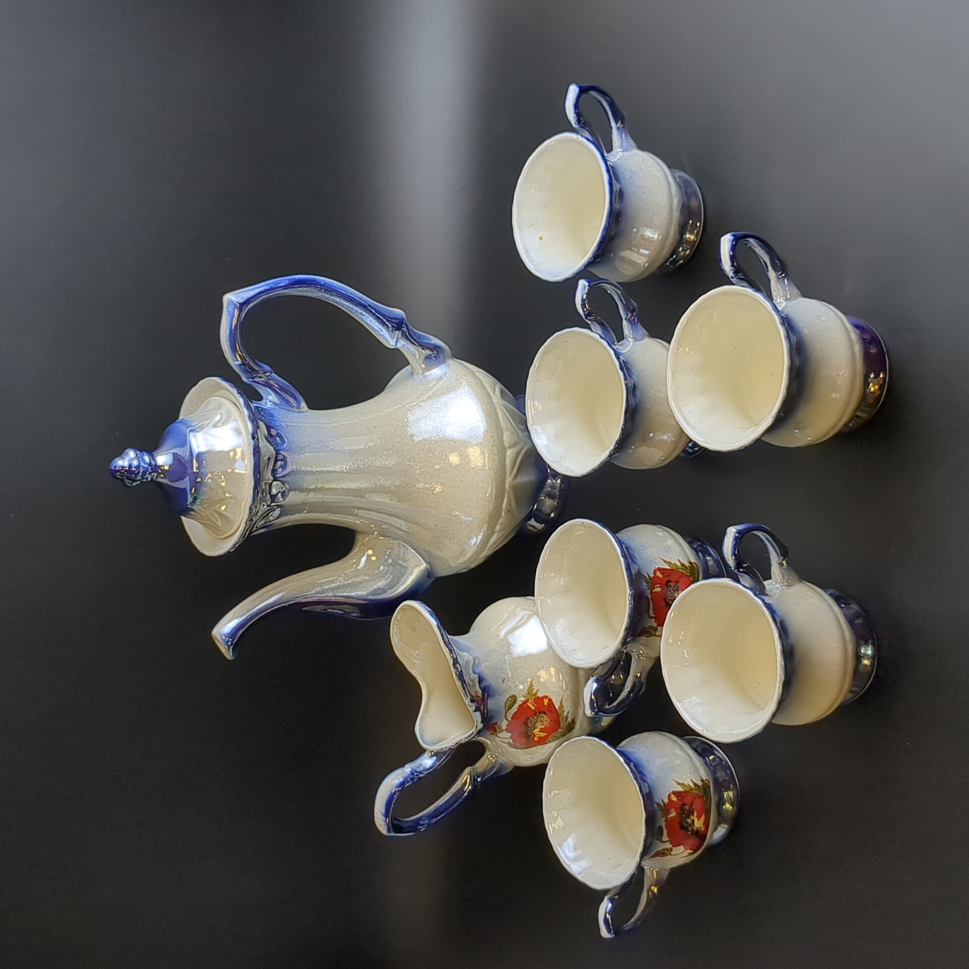 Кофейный набор из советской керамики кофейник, 6 кофейных пар, сливочник (8 предметов), деколь, перламутр, винтаж СССР 1970-1991 гг. Высота кофейной чашки - 7.5 см, высота кофейника- 25 см, высота сливочника - 12 см. Состояние и комплектация на фото