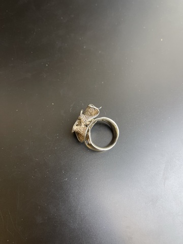 Кольцо крупное, необычное и объёмное, в современном стиле . Оно выполнено в форме стилизованной розы. Контраст между полированными и чернёными деталями делает его ярким и заметным, прибавляет выразительности.