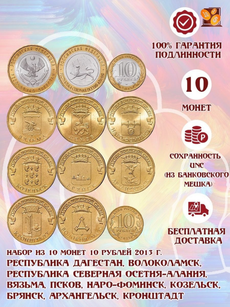 Комплект из 10 монет 10 рублей 2013 года (Биметалл и ГВС). UNC
