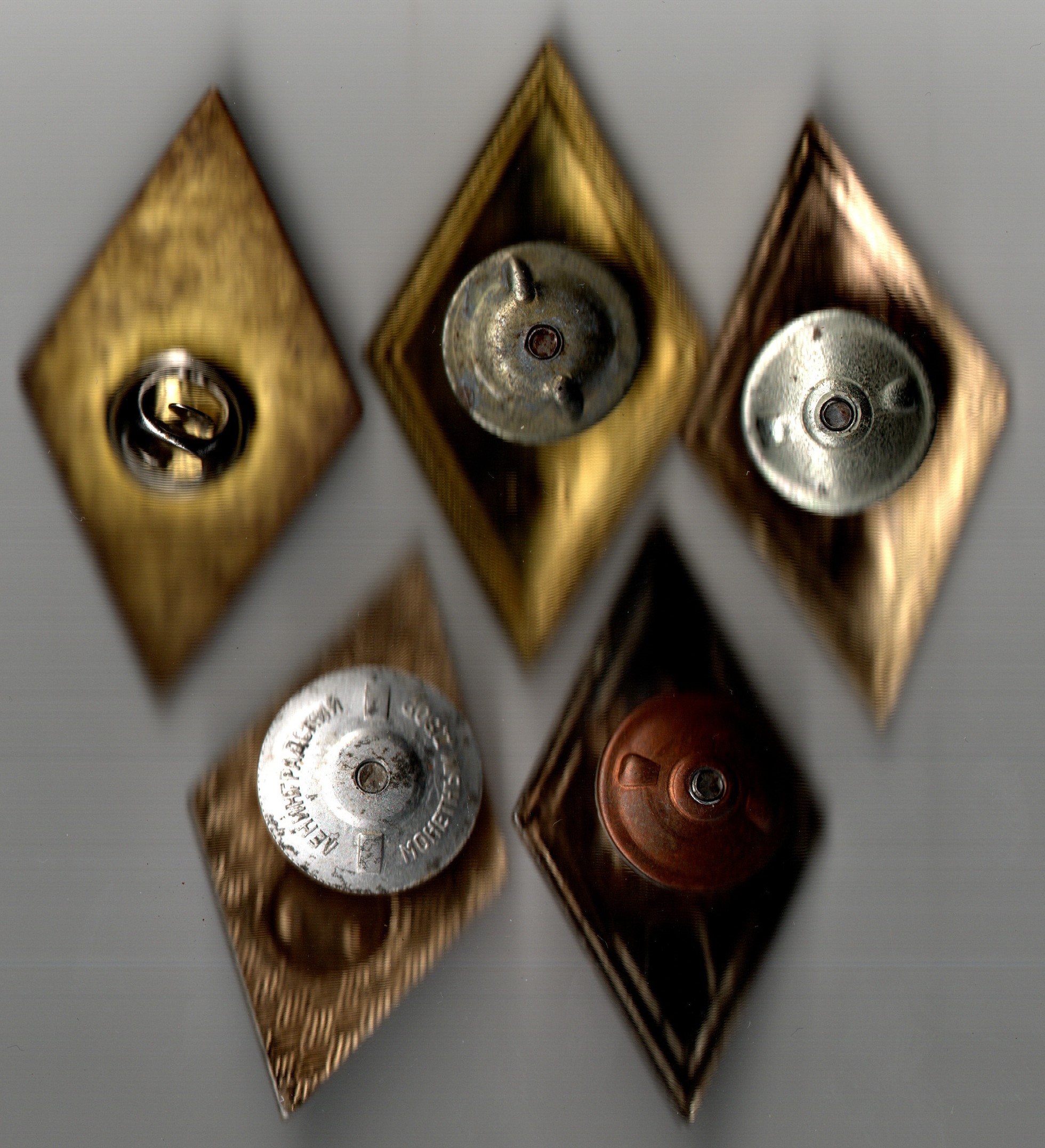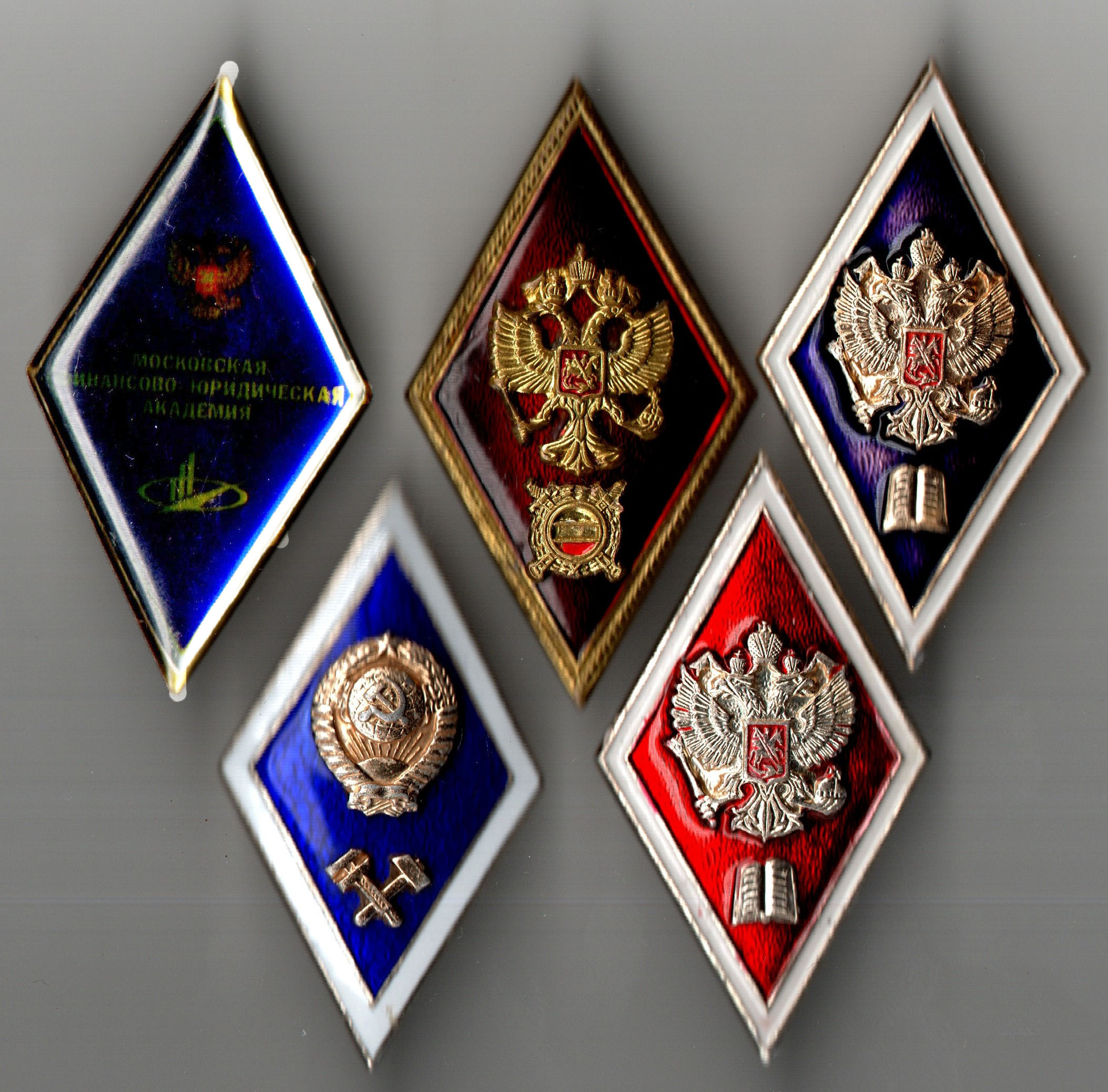 Комплект из 5 Нагрудных академических знаков выпускника ВУЗов: Гуманитарного, Юридического, МВД, МФЮА, Технического СССР. Ромбы. металл алюминий у МВД Латунь - тяжелый. Винт, закрутка, эмали. Состояние на фото