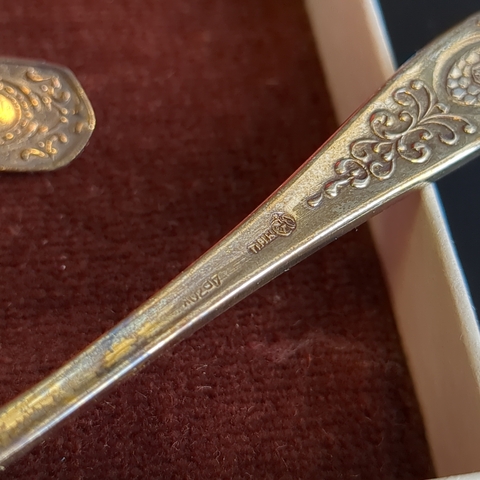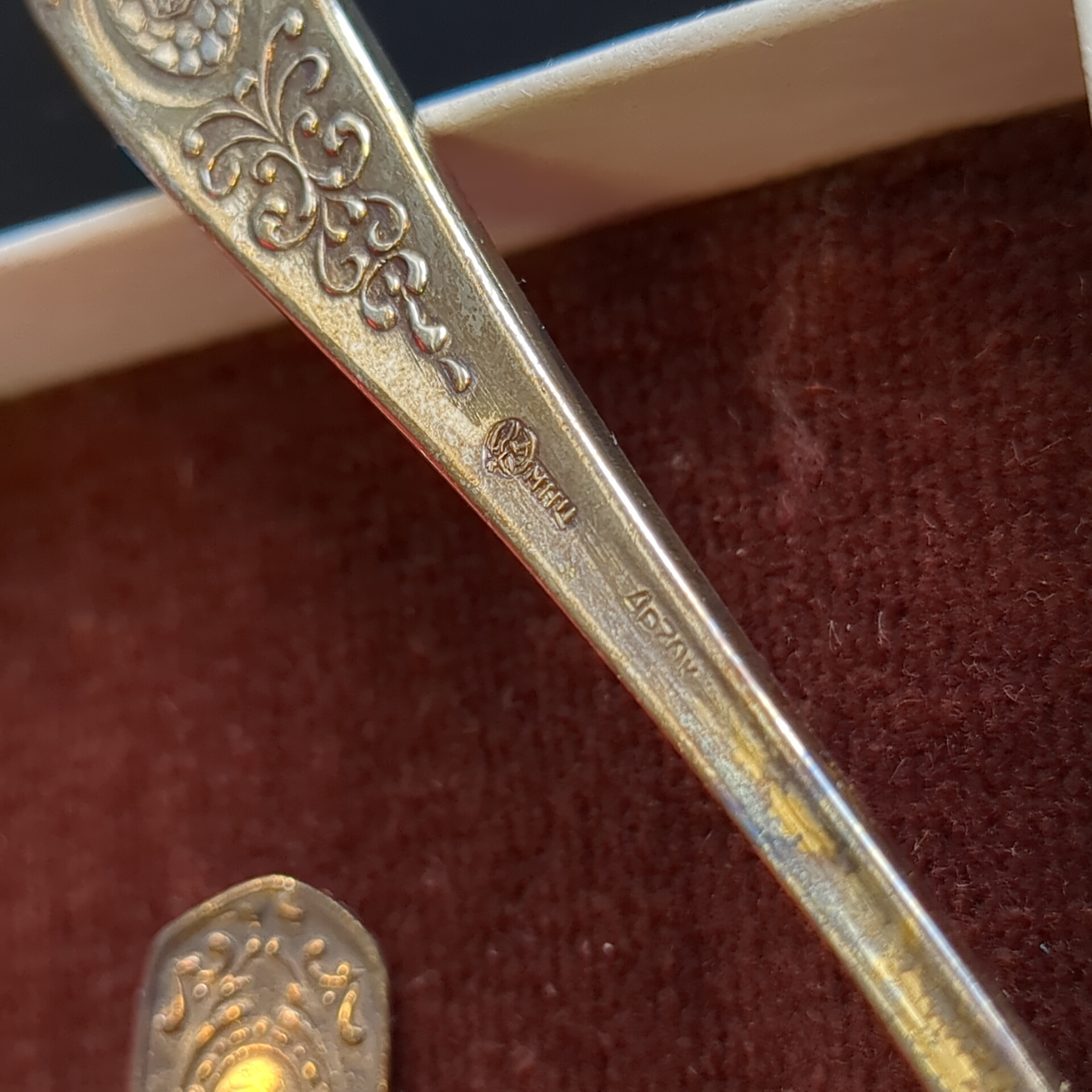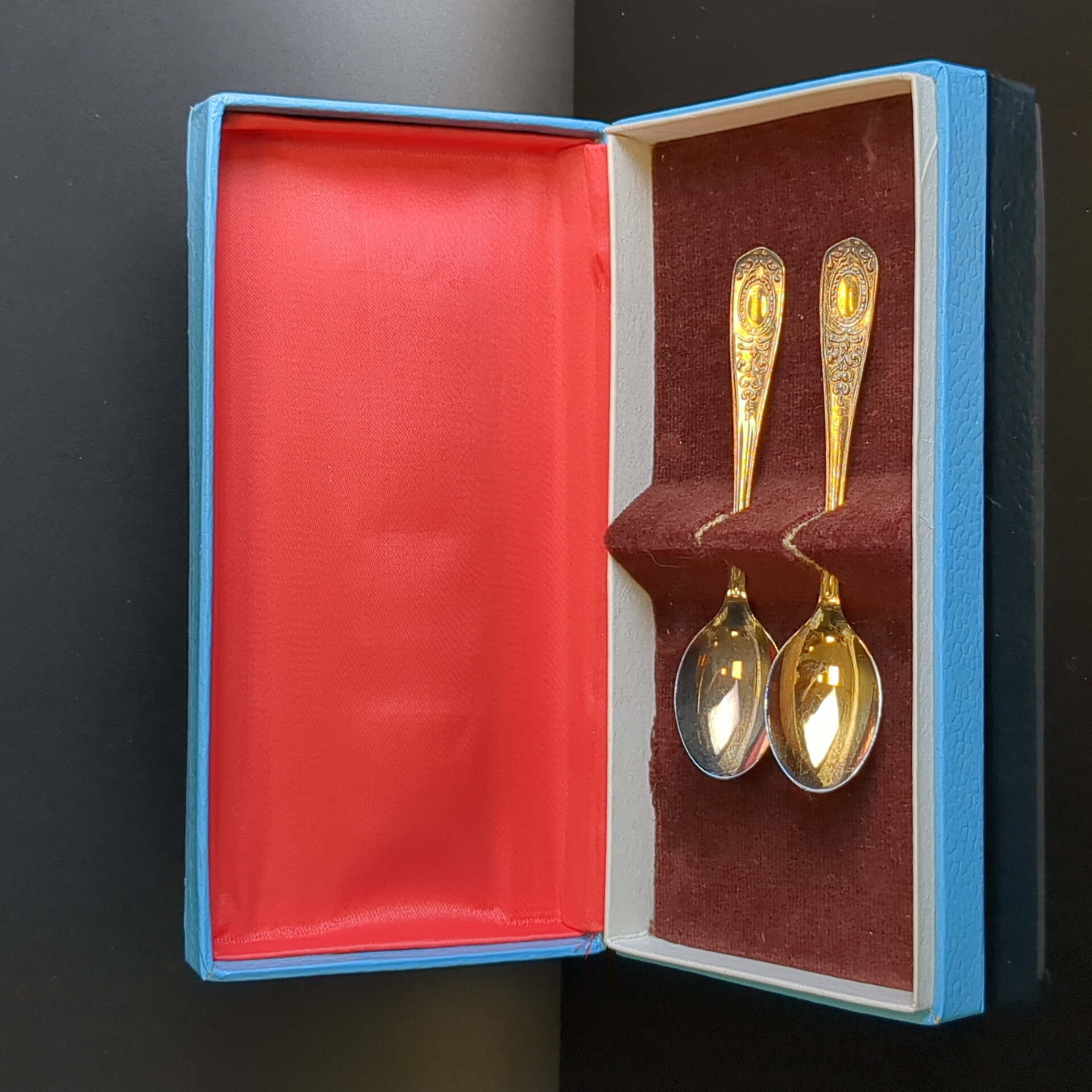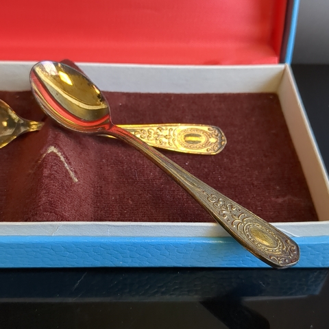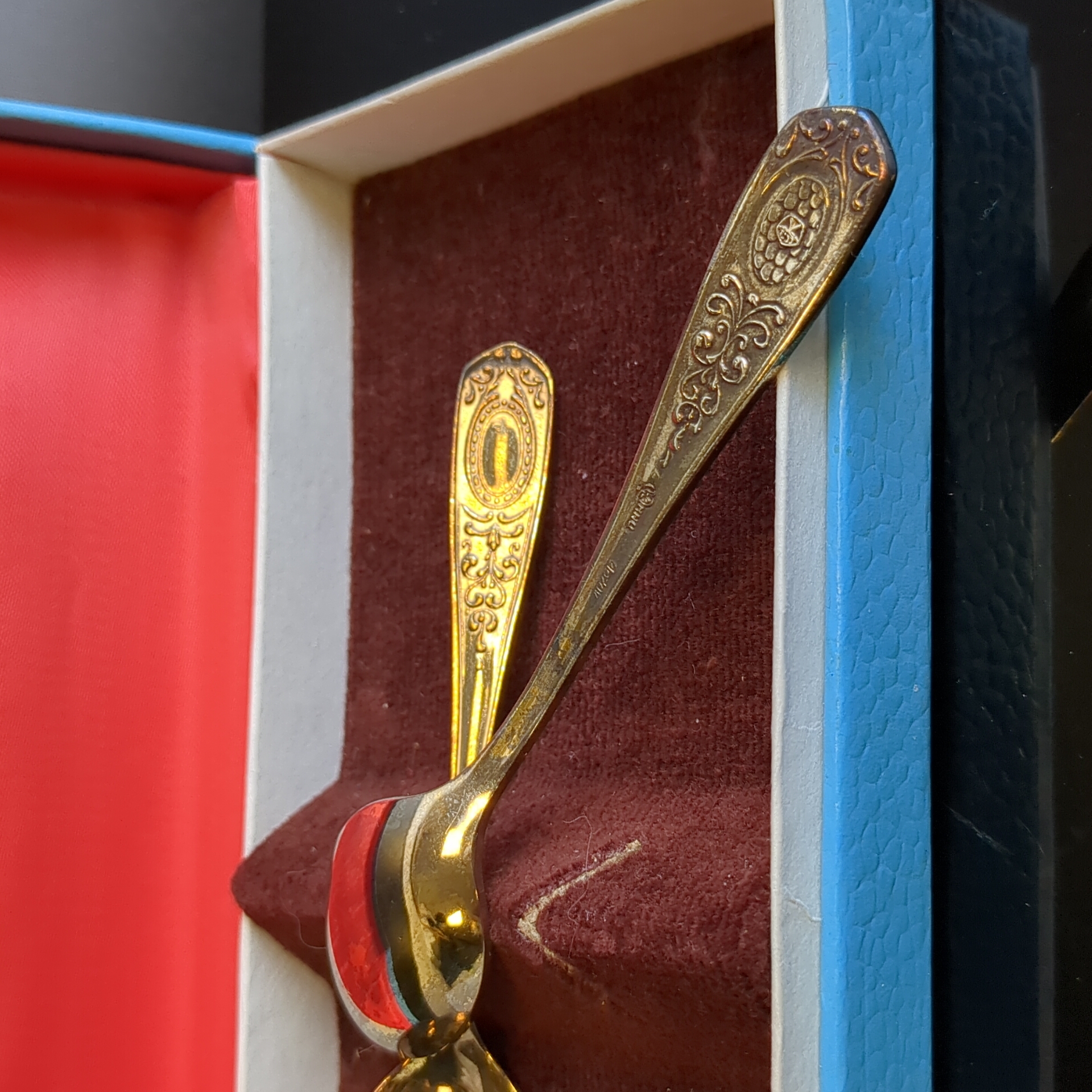 Комплект кофейных ложек на 2 персоны, в оригинальной коробке. мНЦ (медь-никель-цинк), золочение, Кольчугинский завод цветных металлов, СССР, 1970-1990 гг.