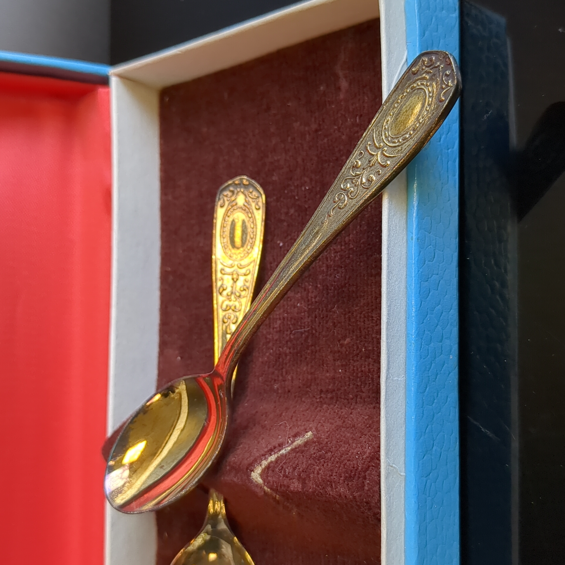 Комплект кофейных ложек на 2 персоны, в оригинальной коробке. мНЦ (медь-никель-цинк), золочение, Кольчугинский завод цветных металлов, СССР, 1970-1990 гг. Присутствует естественная патина. Состояние на фото