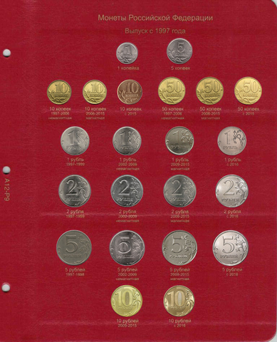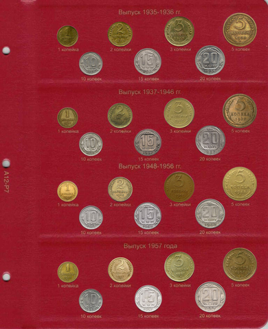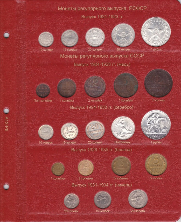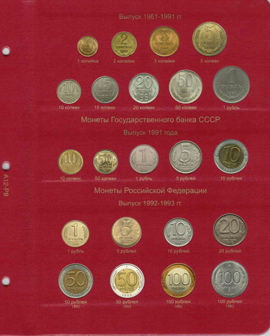 Комплект листов для монет регулярного выпуска РСФСР, СССР и России 1921-2016 гг. (по типам)