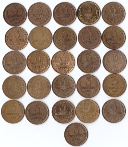 Комплект монет СССР (26шт.)3 коп., 1946,53-55,57,61,67,70-74,76,79,80-91г, VF-XF