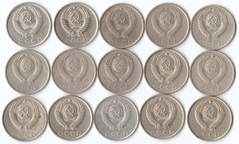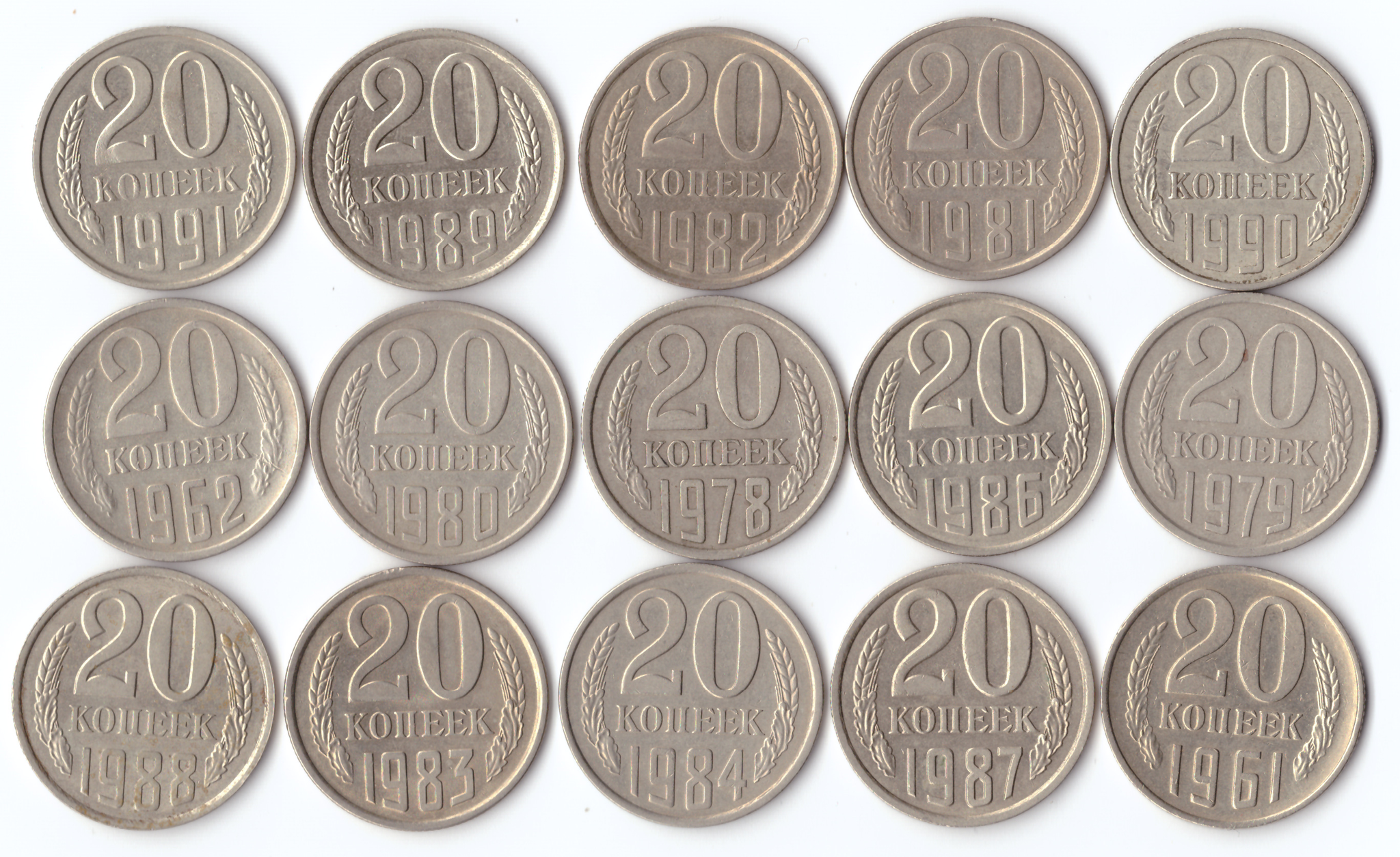 Комплект монет (15шт.) 20 копеек, 1961,62,78-91м. Нет 1985г., XF-UNC