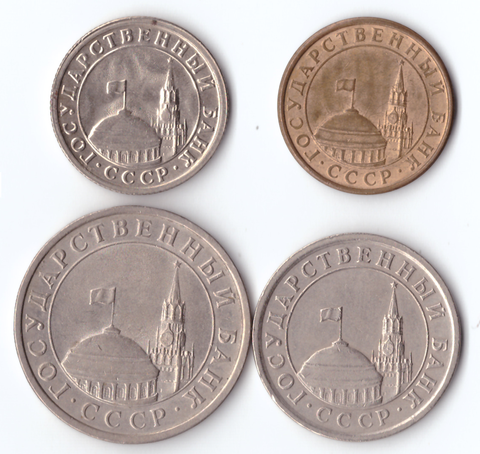 Комплект монет (4шт.) 1991 г. Кремль. 10 копеек м, 50 копеек л- штемп, 1 рубль , 5 рублей , VF