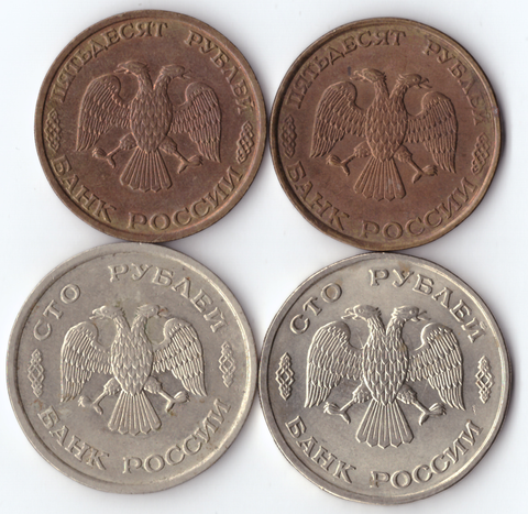 Комплект монет (4шт) 1993г, 50 рублей лмд, ммд, 100 рублей лмд, ммд , XF-UNC