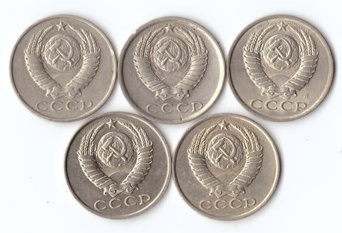 Комплект монет (5шт.) 15 копеек, 1980,85,89,90,91л, XF-UNC
