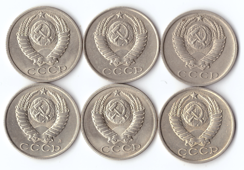 Комплект монет (6шт.) 15 копеек, 1980,84,85,89,90,91л, XF-UNC