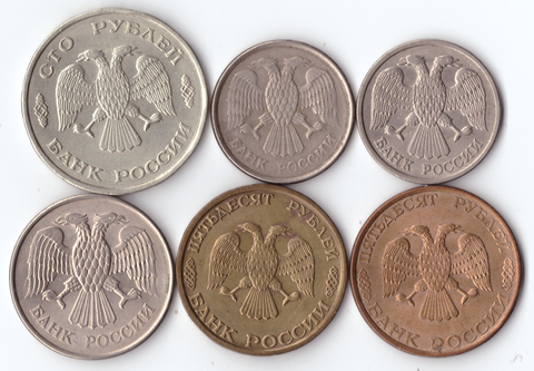 Комплект монет (6шт.) 1993 г, 100 рублей лмд, 50 рублей , 10 рублей лмд, ммд, 20 рублей ммд., VF-XF